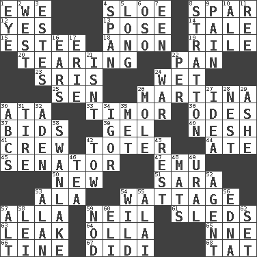 ACROSS 1. She-sheep 4. A type of plum 8. Practice fight 12. Consenting reply 13. Introduce or present, as a question 14. Story 15. First name in cosmetics 18. At once, immediately (arch.) 19. Cause heat under the collar 20. Separating forcefully 22. Baking dish 23. Indian titles of respect 24. Soggy 25. Elected rep. 26. Chrissie's court nemesis 30. _ moment's notice (2 wds.) 33. Southeast Indonesia island 36. Lyric poems 37. Auction offers 39. Set 40. Soft 41. Ship's personnel 42. Carrier 44. Had dinner 45. Elected representative 47. Australian flightless bird 50. ___ Haven, CT 51. "Two Mules for Sister ____" 53. Wing 54. Electrical Measurement 57. Silent film actress Nazimova 59. Famous astronaut Armstrong 61. Bobsleighs 63. Path through which fluid escapes 64. Water jar 65. Compass dir. 66. Prong on a fork 67. "You Light Up My Life" star Conn 68. Make lace DOWN 1. Sight organ 2. 270 degrees 3. _____ Park, CO 4. Connect, as a bridge 5. Protracted 6. Bear (Spanish) 7. Car or cant ending 8. Ski resort town in Vermont 9. Ache 10. Everything 11. To separate or throw off 16. Hearing organs 17. One of the Great Lakes 21. Is not 22. For each 24. Armed conflict 26. Undercover agent 27. The content of cognition 28. Egg locale 29. American tennis player Robert 30. Lettered men learn these first 31. Become fatigued 32. An important port of Yemen 34. Russian composer Stravinsky 35. Was introduced to 38. Tchaikovsky ballet 42. Pull behind 43. Remainder 46. Afternoon social gathering 48. Floor coverings 49. Mountain range 52. Representative 53. Actor Alda or Thicke 54. Uncontrolled 55. Jai _ 56. Pulitzer Prize-winning author Ferber 57. The first octave above the treble staff 58. Luau accessory 59. Allow head to fall sleepily 60. Connecticut Ivy Leaguer 62. Arrange properly for use