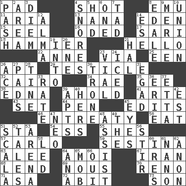 ACROSS 1. Groovy apt. 4. Guess 8. Australian flightless bird 11. Operatic vocal solo 13. Grandmother 14. Locale of original sin 15. Stitch closed the eyes of (a falcon) 16. Wrote a lyric poem 17. Indian skirt 18. More overdramatic by comparison 21. Phone greeting 22. Queen of England 1702-14 23. By way of 25. Car or cant ending 26. Fitting 29. One of the two male reproductive glands 32. Capital of Egypt 34. Actress Charlotte 35. Unit of force equal to gravity 38. Pulitzer Prize-winning author Ferber 39. Hold, grip (Informal) 41. Johnson of "Laugh-In" 43. Arrange properly for use 44. Writing instrument 45. Proofreads 46. Plea 50. Consume 51. R.R. building 54. Curvy letter 55. "______ My Girl" (Turtles hit) 57. Monte _, Las Vegas Hotel/Casino 59. French poetic form 63. Toward shelter 64. Mine, in Marseilles 67. SW Asia republic 68. Grant temporary use of 69. Common sense 70. Former U.S. Attorney General Janet 71. White ___ sheet 72. "This won't hurt ____!" 73. Male child DOWN 1. Romantic infatuation 2. Type of rug 3. South Vietnam president (1954) 4. Sounds asleep 5. Possessed 6. Single 7. Bit 8. Peak District village in England 9. Haggard of country music 10. The state of being joined or united 12. _ mater 14. Compass dir. 19. To the inside or interior of 20. Compass dir. 21. Actor Linden 23. Small bottle 24. On the rocks 26. Adept person 27. Groovy apts. 28. Prong on a fork 30. Heavy duty weighing machine 31. Mild oath 33. Assign a rank or rating to 36. One of the Great Lakes 37. Singer James 39. Flats, for short 40. Possessive pronoun 42. Eastern Standard Time (abbr.) 45. Snake ____ (dice throw) 47. Modern: prefix 48. Help 49. Definite Article 51. Any of the three canals of the cochlea 52. Stories 53. Sports stadium 56. Move through with a circular motion 58. Directed 60. Angers 61. Billionth: prefix 62. At once, immediately (arch.) 64. Santa ___, CA 65. Crowd into 66. Fr. "Yes"