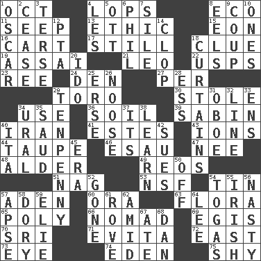 ACROSS 1. Sep. follower 4. Chops off 8. Environmental prefix 11. Ooze 13. Principle of right and wrong 15. Period of immesurable duration 16. Heavy open wagon 17. Not moving 18. A slight indication 19. Slender Brazilian palm 21. Lion 22. United States Postal Service (abbr.) 23. To riddle 24. Lair 27. For each 29. "Corrida" creature 30. Took without asking 34. Purpose 36. The visible part of the earth's surface 39. Unit of acoustic absorption 40. SW Asia republic 41. _____ Park, CO 43. Charged particles 44. Grayish beige 46. Son of Isaac 47. Born 48. Tree or shrub in the Birch family 49. Vintage cars 51. Tired old horse 53. Science/research agcy. 54. Metal container 57. An important port of Yemen 60. Mouth or opening 63. Plants 65. Much (prefix) 66. Wanderer 69. Armor plate that protects the chest 70. _ Lanka 71. Webber/Rice musical 72. 90 degrees 73. Sight organ 74. Locale of original sin 75. Like a shrinking violet DOWN 1. Motion picture award 2. Desist 3. Laconic 4. French article 5. Baseball player Mel 6. Silvers or Donahue 7. Drop; flow; fall 8. Snakelike fish 9. Overturn; upset 10. Singles 12. Parent Teacher Association (abbr.) 14. Hoof sound 18. Window treatments 20. Wedding promise 25. Celtic language 26. Trap for birds or small mammals 28. Curvy letter 29. 3-inch nail 31. Mitch Miller's instrument 32. Actor's bit 33. Followers of ems 34. Mountain range 35. Saudi Arabian king (1953-1964) 37. ___ a Wonderful Life 38. Acquire or gain knowledge or skills 40. Call ___ day 42. Takes to court 45. Epoch 50. No longer planned or scheduled 52. Went 54. Ancient Roman robes 55. From or relating to Ireland 56. Smutty 57. Domed church section 58. Dinghy 59. Writer Wiesel 61. Be footloose 62. Among 64. Area sheltered from the wind 67. Had dinner 68. One of the 12 tribes of Israel