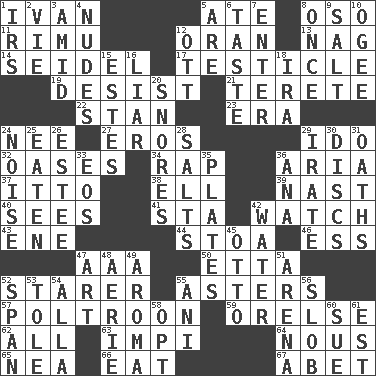 ACROSS 1. "Terrible" tsar 5. Had dinner 8. Bear (Spanish) 11. Tall New Zealand timber tree 12. NW Algerian seaport 13. Tired old horse 14. Beer mug 17. One of the two male reproductive glands 19. Stop 21. Cigar-shaped 22. Comedian Laurel of Laurel & Hardy 23. Epoch 24. Born 27. Greek god of love 29. Wedding promise 32. Fertile tracts in a desert 34. Reproach for some lapse or misdeed 36. Roberta Peters solo 37. "Tell ____ the Marines!" 38. Pipe bend 39. Political cartoonist Thomas 40. Observes 41. R.R. building 42. Timepiece 43. Compass dir. 44. Portico 46. Curvy letter 47. Auto club (abbr.) 50. Singer James 52. A viewer who gazes fixedly 55. Michaelmas daisies 57. Coward 59. Threatening words 62. 100% 63. Body of Kaffir warriors 64. Good sense 65. Teachers' org. 66. Ingest 67. Collude with DOWN 1. Big collection agency 2. Compete 3. Among 4. Unclothed pictures 5. "We ___ not amused" (Victoria) 6. Clothes sense 7. Keyboard key 8. At one time in the past 9. Table seasoning 10. Double curve, resembling the letter S 12. Baseball player Mel 15. _____ Park, CO 16. One who doesn't tell the truth 18. Lyricist Gershwin 20. Sounds asleep 24. Annoying sound 25. Consumed 26. First name in cosmetics 28. Table seasonings 29. Feeling or showing extreme anger 30. Flat circles 31. Profane or obscene expressions 33. Greek goddess of the dawn 35. Food holders 36. Santa ___, CA 42. Wetness 45. Von Bismarck 47. Tate display 48. Nest on high 49. Scent 51. Sports stadium 52. Connect, as a bridge 53. Lacquered or enameled metalware 54. Silent film actress Nazimova 55. Cuckoo 56. Oscar Madison type 58. Elect 60. Institute legal proceedings 61. Eastern Standard Time (abbr.)
