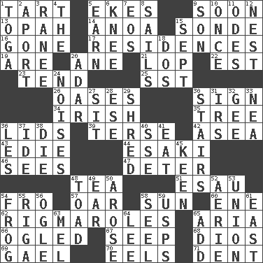 ACROSS 1. Small pie 5. Makes supply last 9. Within a short period 13. Brightly colored fish 14. Small Philippine buffalo 15. Something which is sent 16. Went 17. Homes 19. "We ___ not amused" (Victoria) 20. A saturated hydrocarbon 21. Trim (branches) 22. Eastern Standard Time (abbr.) 23. Look after 25. Fast jet (abbr.) 26. Fertile tracts in a desert 30. Omen 34. From or relating to Ireland 35. Relationship diagram 36. Flaplike coverings 39. Laconic 42. Toward the sea 43. Singer Brickell 44. 1973 Nobel Price Winner (Physics) Leo 46. Observes 47. Prevent from occurring 48. Afternoon social gathering 51. Son of Isaac 54. From 57. Boat paddle 58. Player for Phoenix 60. Compass dir. 62. Complicated, petty procedures 65. Operatic vocal solo 66. Stared at amorously 67. Ooze 68. "Vaya con ____" 69. Highlander 70. Snakelike fish 71. Gouge DOWN 1. Ancient Roman robe 2. To the left, to Queeg 3. Indian princess (variant) 4. Definite Article 5. Merit 6. Leg joint 7. Greek goddess of the dawn 8. Moves on water 9. Male offspring 10. Single time 11. Lyric poems 12. Egg locale 15. Back-to-school mo. 18. Two (Sp.) 20. The sixth month of the Jewish calendar 24. Annoying sounds 27. Be seated 28. Compass dir. 29. Fragment 30. Flight of steps 31. Big collection agency 32. Turn to the right 33. Teachers' org. 36. French article 37. Binary compound 38. Pass on 40. Compass dir. 41. Consume 45. Peachy ____! 48. Frog relative 49. Hearing organ 50. Came up 52. Nest on high 53. The state of being joined or united 54. Tree-dwelling hopper 55. Port city in Latvia 56. Stare at amorously 58. Sew up the eyelids of hawks and falcons 59. United States Postal Service (abbr.) 61. 90 degrees 63. Cartoonist voice _ Blanc 64. Area sheltered from the wind 65. Say or write further