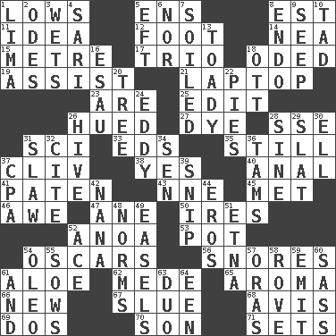 ACROSS 1. Coldest temperatures 5. Followers of ems 8. Eastern Standard Time (abbr.) 11. The main thing one is thinking about 12. Pick up the tab 14. Teachers' org. 15. Distance measurement (Brit.) 17. Musical group of three 18. Wrote a lyric poem 19. Aid 21. Portable computer 23. "We ___ not amused" (Victoria) 25. Prepare for publication 26. Became colored 27. Color 28. Compass dir. 31. _-fi 33. Begley and Asner 35. Free from disturbance or agitation 37. 154 in Roman numerals 38. It is so 40. Of or related to the anus 41. Eucharist need 43. Compass dir. 45. Was introduced to 46. Deep reverence 47. A saturated hydrocarbon 50. Angers 52. Small Philippine buffalo 53. Cooking vessel 54. Motion picture awards 56. Sounds asleep 61. _ vera 62. Ancient Persian 65. Odor 66. ___ Haven, CT 67. Change direction abruptly 68. Opinion 69. Two (Sp.) 70. Manchild 71. Arranges properly for use DOWN 1. Pale green bean 2. Lyric poems 3. Soaks 4. Indian skirt 5. Bank Draft (abbr.) 6. And not 7. Dirtied 8. Inside; within (prefix) 9. Ooze 10. Small boy 13. Sycophant 16. He sold his birthright 18. Baseball player Mel 20. Family _ (genealogy) 22. Sliced desserts 24. Whirlpool 26. Hub of activity 28. Trig term 29. Narrow board 30. Pipe bend 31. Cole _ (cabbage dish) 32. Quote 34. Elected rep. 36. Scottish caps 37. Numbers guy (abbr.) 39. Clip 42. Nanny 44. Greek god of love 48. Typical models 49. Artist's stands 51. Inactive volcano in Sicily 52. Adept person 54. Margarine 55. Sty mamas 57. Mouths or openings 58. Be footloose 59. Send forth 60. Backtalk 61. Also 63. Superhero pair 64. Car or cant ending
