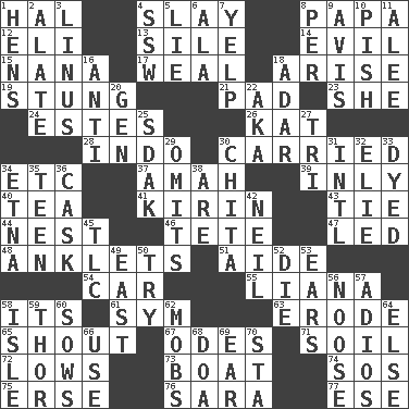 ACROSS 1. Actor Linden 4. Kill 8. Dad 12. Biblical high priest 13. Drop; flow; fall 14. Tending to cause great harm 15. Nanny 17. Welt 18. Originate 19. Feeling sharp psychological pain 21. Writing tablet 23. A female animal or person 24. _____ Park, CO 26. Krazy ___ of comics 28. _ china 30. Borne 34. And so on (abbr.) 37. Wet nurse 39. Inwardly 40. Afternoon social gathering 41. Japanese brewing company 43. Neckwear 44. A home for chicks 46. Wig 47. Directed 48. Short socks 51. Assistant 54. Auto 55. Woody, climbing, usually tropical plant 58. It is 61. Symbol (abbr.) 63. Wear away 65. Yell 67. Lyric poems 71. Earth 72. Moos 73. Water vessel 74. Distress signal 75. Celtic language 76. "Two Mules for Sister ____" 77. Compass dir. DOWN 1. Coop moms 2. Having winglike extensions 3. "_ and Lucy" (Charlie Brown theme song) 4. Compass dir. 5. Falsehood 6. According to 7. Sharp bark 8. For each 9. Advice 10. Expression of disdain 11. Toward shelter 16. Opposed to 18. The sixth month of the Jewish calendar 20. Commissioned mil. rank 22. Alias (abbr.) 25. Neighbor of Neb. 27. Three (prefix) 29. Leaves out 30. Riviera of "Kiss of the Spider Woman" 31. International (abbr.) 32. Writer Wiesel 33. Colored 34. Inactive volcano in Sicily 35. Adolescent 36. Keg 38. "We ___ not amused" (Victoria) 42. Famous astronaut Armstrong 45. Affectionate concern, for short 49. 90 degrees 50. Attempt 52. Expire 53. Hearing organs 56. Trap for birds or small mammals 57. Goodbye (Sp.) 58. Small island 59. Son of Odin 60. Sty mamas 62. Disorderly crowds 64. Otherwise 66. Purpose 68. ___ good deed 69. Hearing organ 70. R.R. building