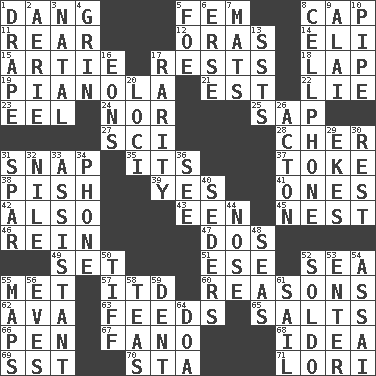 ACROSS 1. Mild oath, euphamism for damn 5. Opposite of masc. 8. Head covering 11. Located in or toward the back 12. Mouths or openings 14. Connecticut Ivy Leaguer 15. Nick name for Arthur 17. Musical pauses 18. Pet locale 19. Player piano 21. Eastern Standard Time (abbr.) 22. Whopper 23. Snakelike fish 24. Not either 25. Plant excrement 27. _-fi 28. "Mermaids" star 31. Fastener 35. ___ a Wonderful Life 37. Puff or smoke 38. Expression of disdain 39. Consenting reply 41. Singles 42. In addition 43. Car or cant ending 45. A home for chicks 46. It's straight from the horse's mouth 47. Two (Sp.) 49. Arrange properly for use 51. Compass dir. 52. Ocean 55. Was introduced to 57. It would 60. Thinks logically 62. Actress Gardner 63. Gives food to 65. Table seasonings 66. Writing instrument 67. Papal veil 68. The content of cognition 69. Fast jet (abbr.) 70. R.R. building 71. Australian parrot (variant) DOWN 1. Window treatment 2. Nest on high 3. Relating to or accompanying birth 4. Amused look 5. Enemy 6. Celtic language 7. Floor protectors 8. Portable communications device 9. Jai _ 10. Corncob 13. Fast planes 16. Immeasurably long periods of time 17. Noteworthy scarcity 20. Venues 26. 13-14th century defensive garment 29. Makes supply last 30. Remainder 31. Practice fight 32. The longest river in the world 33. Helper 34. Give a jingle 36. Perceive with the eye 40. Spring feasts 44. Olfactory organ 48. Oceans 50. Small quarrel 52. Twentieth part of a lira 53. Keyboard key 54. Slender Brazilian palm 55. Atlas contents 56. Nights before holidays 58. Afternoon social gatherings 59. Undesirable depression on a surface 61. Travel by water 64. ___ good deed