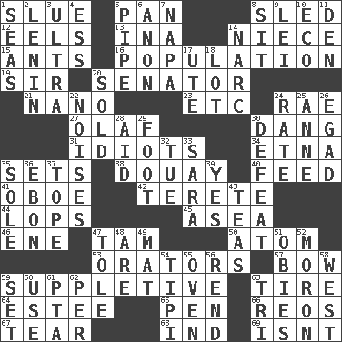 ACROSS 1. Turn sharply 5. Baking dish 8. Downhill vehicle 12. Snakelike fish 13. _ tizzy (2 wds.) 14. Sibling's daughter 15. Pismires 16. Census information 19. Title for a knight 20. Elected representative 21. Billionth: prefix 23. And so on (abbr.) 24. Actress Charlotte 27. Norwegian king 30. Mild oath, euphamism for damn 31. Foolish or stupid persons 34. Inactive volcano in Sicily 35. Puts into a specified state 38. A city in N France, SE of Calais 40. Nourish 41. Mitch Miller's instrument 42. Cigar-shaped 44. Chops off 45. At sea 46. Compass dir. 47. Scottish cap 50. Smallest unit of an element 53. Speakers 57. Ribbon knot 59. Supplying deficiencies 63. Hoop that covers a wheel 64. First name in cosmetics 65. Animal enclosure 66. Vintage cars 67. Lacerate 68. Working for oneself (abbr.) 69. Is not DOWN 1. Oceans 2. Soviet premier 1918-24 3. Extremist 4. Double-curved letter 5. Corncob 6. Soon (poet.) 7. California wine valley 8. Be seated 9. Luau accessory 10. Environmental prefix 11. Lair 14. Drug cop 17. Shoshoni 18. Car dealer's back yard 20. Exchanged or delivered for money 22. Annoying sounds 24. Assign a rank or rating to 25. Queen of England 1702-14 26. Mild oath 28. Assist 29. Pick up the tab 30. Outscore 32. Third day of the wk. 33. "Two Mules for Sister ____" 35. Not divided or shared with others 36. Inky black, to poets 37. Drink excessively 39. It is so 43. Afternoon social gatherings 47. Lacquered or enameled metalware 48. "We ___ not amused" (Victoria) 49. Floor protector 51. Off-Broadway awards 52. Person of subnormal intelligence 54. Native american tent (variation) 55. Baking chamber 56. Tear apart 58. Compass direction 59. Put into a specified state 60. Purpose 61. Parent Teacher Assoc. 62. For each 63. Three (prefix)
