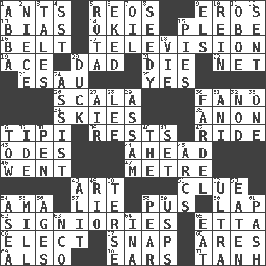 ACROSS 1. Pismires 5. Vintage cars 9. Greek god of love 13. Prejudice 14. Migrant worker of the '30s 15. Military trainee 16. Waist strap 17. Household entertainment appliance 19. Adept person 20. Male parent 21. Expire 22. Fish or hair follower 23. Son of Isaac 25. Affirmative reply 26. Any of the three canals of the cochlea 30. Papal veil 34. Atmospheres 35. At once, immediately (arch.) 36. Native american tent (variation) 39. Musical pauses 42. Travel on an animal 43. Lyric poems 44. Toward the future 46. Gone 47. Distance measurement (Brit.) 48. Nonscientific branch of learning 51. A slight indication 54. Nursemaid (var.) 57. Falsehood 58. Product of festering 60. Pet locale 62. Seigniories (variant) 65. Singer James 66. Choose 67. Fastener 68. Ancient Greek god of war 69. In addition 70. Hearing organs 71. Hyperbolic tangent DOWN 1. Swedish rock group 2. Sibling's daughter 3. Stories 4. Fast jet (abbr.) 5. Roll call or roster of names 6. Supplemented with great effort 7. Lubricate 8. Morally degraded 9. Raised railways 10. It's straight from the horse's mouth 11. Mitch Miller's instrument 12. Posted 15. Sliced desserts 18. Compete 20. Evade 24. Aid 27. Wind 28. Area sheltered from the wind 29. Indian state 30. Pack 31. Black tropical American cuckoo 32. Allow head to fall sleepily 33. Single 36. Pull behind 37. Binary compound 38. Animal enclosure 40. Definite Article 41. Put into a specified state 45. Curves 48. Set down 49. River (Sp.) 50. Laconic 52. Extreme 53. Eroded 54. At sea 55. Place where flour is made 56. Eras 58. Lightbulb-shaped fruit 59. United States Postal Service (abbr.) 61. Romantic infatuation 63. Non-commissioned officer (abbr.) 64. _ tizzy (2 wds.) 65. Ingest