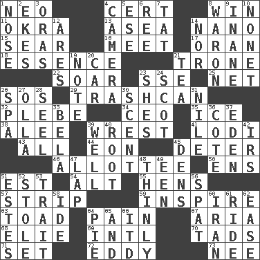 ACROSS 1. Modern: prefix 4. An absolute certainty 8. Acquire through effort 11. Gumbo ingredient 13. Toward the sea 14. Billionth: prefix 15. Shrivel 16. Rendezvous 17. NW Algerian seaport 18. Center 21. Marketplace scale 22. Fly high 23. Compass dir. 25. Remaining after all deductions 26. Mayday 29. File 13 32. Military trainee 34. Corporate head (abbr.) 35. Frozen water 38. Toward shelter 39. Obtain by seizing forcibly or violently 41. Farming town in central California 43. 100% 44. Period of immesurable duration 45. Prevent from occurring 46. One to whom something is allotted 50. Followers of ems 51. Eastern Standard Time (abbr.) 54. The first octave above the treble staff 55. Coop moms 57. Remove all contents or possession from 59. Heighten or intensify 63. Frog relative 64. Ache 67. Operatic vocal solo 68. Writer Wiesel 69. International (abbr.) 70. Small boys 71. Put into a specified state 72. Whirlpool 73. Born DOWN 1. Olfactory organ 2. Supplements with great effort 3. Mouths or openings 4. Device for capturing images 5. Compass dir. 6. To sift 7. Make lace 8. Make _____ (do battle with) 9. Empty; void 10. Music written for nine 12. Ancient Greek god of war 14. Not either 19. Observe 20. Auto 21. Afternoon social gathering 23. "______ My Girl" (Turtles hit) 24. Highlander 26. Health resort 27. Water jar 28. Sew up the eyelids of hawks and falcons 30. Odor 31. "Death on the ____" 33. Actor Lugosi 36. ____ d'Azur (French Riviera) 37. Paradise 39. Not ill 40. Carrot, for example 42. Big collection agency 45. Lairs 47. Infant locale 48. Without force or sincere effort 49. Car or cant ending 51. _____ Park, CO 52. Fur scarf 53. Distinguishing feature 56. Petty quarrel 58. Binary compound 60. SW Asia republic 61. Travel on an animal 62. Comfort 64. Sliced dessert 65. Also 66. It would
