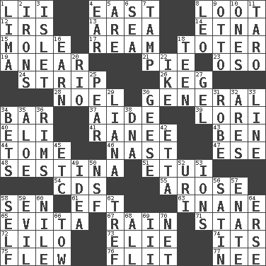 ACROSS 1. Cards in a Roman deck? 4. Compass direction 8. Spoils 12. Big collection agency 13. Length times width 14. Inactive volcano in Sicily 15. Undercover agent 17. 480, 500 or 516 sheets of paper 18. Carrier 19. Approach 21. Sliced dessert 23. Bear (Spanish) 24. Empty completely 26. Barrel 28. Christmas carol 30. Commissioned military rank 34. Tavern 37. Assistant 39. Australian parrot (variant) 40. Biblical high priest 41. Indian princess (variant) 43. Benjamin's nick name 44. Heavy book 46. Political cartoonist Thomas 47. Compass dir. 48. French poetic form 51. Needle holder 54. Music discs 55. Came up 58. Elected rep. 61. Lizard (obsolete) 63. Silly 65. Webber/Rice musical 67. Water falling in drops from the sky 71. Play the lead 72. _ and Stitch 73. Writer Wiesel 74. It is 75. Soared 76. Secret move to avoid paying debts 77. Born DOWN 1. Pale green bean 2. Metal shackles 3. Small island 4. Ewer handle 5. "We ___ not amused" (Victoria) 6. Ocean 7. Pack (down) 8. Lion 9. "Beetle Bailey" pooch 10. Washington bills 11. Pacific island yam 16. Merit 18. Adolescent 20. River (Sp.) 22. Eisenhower's nickname 25. Lightbulb-shaped fruit 27. Set 29. Climbing, woody, usually tropical vines 30. Honkers 31. Loose flowing garment 32. Ancient Greek god of war 33. Actor's bit 34. Wagers 35. Medicinal plant 36. Basketball hoops 38. Heredity factor (abbr.) 42. Singer James 45. And so on (abbr.) 49. The main thing one is thinking about 50. Overdraft (abbr.) 52. RI univ. 53. Charged atoms 56. Smooth fabric 57. Maternal 58. Automatic 59. Tending to cause great harm 60. The longest river in the world 62. Not kosher 64. Celtic language 66. Pull behind 68. 100% 69. One more than two 70. Fish or hair follower