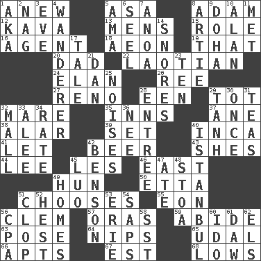 ACROSS 1. Afresh 5. White ___ sheet 8. First man 12. Polynesian shrub of the pepper family 13. Not women's 15. Hero or heavy, e.g. 16. Rep 18. A really long time 19. Not this but _ 20. Male parent 22. Of or relating to Laos or its people 24. Style 26. Portuguese money of account (variant) 27. Western Nevada city 28. Car or cant ending 29. Small child 32. Female horse 35. Lodging establishments 37. One (Scot) 38. Having or resembling wings 39. Arrange properly for use 40. South American Indian 41. Allow 42. Fermented drink made from hops 43. "______ My Girl" (Turtles hit) 44. Area sheltered from the wind 45. French article 46. Compass direction 49. Attila the _ 50. Singer James 51. Opts 55. A really long time 56. Clement's nick name 57. Mouths or openings 59. Tolerate 63. Introduce or present, as a question 64. Pinches, bites 65. Hereditary estate 66. Flats, for short 67. Eastern Standard Time (abbr.) 68. Coldest temperatures DOWN 1. Alias (abbr.) 2. Tired old horse 3. Night before a holiday 4. Nomad 5. Wet nurse (var.) 6. Sew up the eyelids of hawks and falcons 7. Small Philippine buffalo 8. Nick name for Arthur 9. Capital of the state of Qatar 10. Actor Alda or Thicke 11. Was introduced to 14. Sounds asleep 17. Story 21. One of the 12 tribes of Israel 23. "___ Little Indians" 25. Annoying sounds 28. Main course 29. Hyperbolic tangent 30. At one time in the past 31. Beverages made from leaves 32. Shopping center 33. Toward shelter 34. Pace 36. Born 40. Byzantium, centuries later 42. Gillaume's butler role 45. Nilotic language 47. Had dinner 48. Portico 49. Dwellings 51. Hoof sound 52. Command 53. One of the Great Lakes 54. Plant excrements 56. Accounting whiz (abbr.) 58. Fast jet (abbr.) 60. Wedding promise 61. Obsolete 62. Raised railways