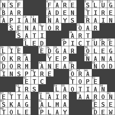 ACROSS 1. Science/research agcy. 4. Conductor's collection 8. A hard, heavy blow 12. Long, evenly shaped piece 13. An important port of Yemen 14. Become fatigued 15. Bee-related 18. Negative votes 19. Precipitation 20. Legislator 22. Boat paddle 23. Suttee (variant) 24. Nonscientific branch of learning 25. Directed 26. Photo 30. Falsehood 33. _ Allan Poe 36. Cassini of fashion 37. Gumbo ingredient 39. Slangy assent 40. Grandmother 41. Dormintory (informal) 42. Approach 44. Allow head to fall sleepily 45. Heighten or intensify 47. Mouth or opening 50. And so on (abbr.) 51. Drink excessively 53. Big collection agency 54. Of or relating to Laos or its people 57. Singer James 59. Den 61. Composer Copland 63. Heroin 64. _ mater 65. Compass dir. 66. Lacquered or enameled metalware 67. Frolic 68. Morning condensation DOWN 1. Basketball assoc. 2. Plant excrements 3. Strips of potato fried in deep fat 4. Papal veil 5. The sixth month of the Jewish calendar 6. Marina Del _, California 7. Followers of ems 8. Ski resort town in Vermont 9. One who doesn't tell the truth 10. RI univ. 11. Commissioned military rank (abbr.) 16. Of or related to the anus 17. Nathan's nickname 21. Event that recurs at intervals 22. The grampus (Milton) 24. Wind 26. Dad 27. ____ Bator, Mongolia 28. Western Nevada city 29. Mild oath 30. Farming town in central California 31. Picture 32. Blunders 34. Centimeter-gram-second unit of force 35. Turn to the right 38. Electrical Measurement 42. Curve 43. Printing process, for short 46. It is 48. Round or rotation of duties 49. Capital of Western Samoa 52. Having ears or earlike features 53. Slanted text style (abbr.) 54. Pale green bean 55. Like ___ of sunshine 56. Characteristic smell of wine 57. Eastern Standard Time (abbr.) 58. Ring climax 59. Infant locale 60. 100% 62. ___ Haven, CT