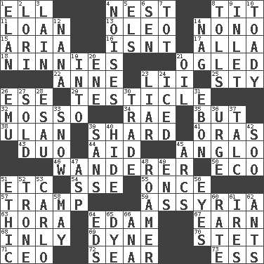 ACROSS 1. Pipe bend 4. Egg locale 8. Teat (slang) 11. Grant temporary use of 13. Margarine 14. Words to Nanette 15. Roberta Peters solo 16. Is not 17. Silent film actress Nazimova 18. Simpletons 21. Stared at amorously 22. Singer Murray 23. Cards in a Roman deck? 25. Filthy place 26. Compass dir. 29. One of the two male reproductive glands 32. With motion or animation 34. Actress Charlotte 35. Yet 38. ____ Bator, Mongolia 39. Broken piece 41. Mouths or openings 43. Superhero pair 44. Assist 45. White American of non-Hispanic descent 46. Nomad 50. Environmental prefix 51. And so on (abbr.) 54. Compass dir. 55. At one time in the past 57. _____ steamer (cargo ship) 59. Nineveh was its capital 63. Israeli folk dance 64. Dutch treat 67. Merit 68. In an inward manner 69. Unit of force 70. Proofreading order 71. Corporate head (abbr.) 72. Burn superficially 73. Double-curved letter DOWN 1. Flair 2. Australian parrot (variant) 3. (Had) reclined 4. Annoying sounds 5. Raised railways 6. Elected rep. 7. Small child 8. For Whom the Bell _____ 9. An arm off of a larger body of water 10. Sycophant 12. Grandmother 14. Tired old horse 19. To the inside or interior of 20. Compass dir. 21. Lubricate 23. One who doesn't tell the truth 24. On the rocks 26. Australian flightless bird 27. Disposed of to a purchaser 28. Son of Isaac 30. Exchange 31. Inky black, to poets 33. Frozen precipitation 36. Goad 37. Baby powder 39. Without 40. Flintstone garb 42. "Barney Miller" actor Jack 45. Arches 47. Viper 48. Wanderer 49. Followers of ems 51. Principle of right and wrong 52. Marketplace scale 53. Monte _, Las Vegas Hotel/Casino 56. Snake ____ (dice throw) 58. Can I? 60. Assign a rank or rating to 61. Angers 62. Pismires 64. Begley and Asner 65. Color 66. Santa ___, CA