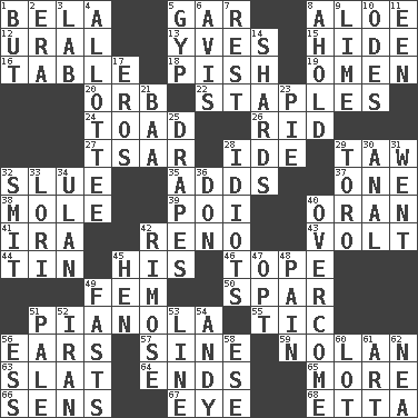 ACROSS 1. Actor Lugosi 5. Slender fish 8. _ vera 12. Mountain range 13. Jacques Cousteau's middle name 15. Flintstone garb 16. Eating place 18. Expression of disdain 19. Sign of something about to happen 20. Globe 22. Paper fasteners 24. Frog relative 26. To free from 27. Russian ruler of old 28. Binary compound 29. The 23rd letter of the Hebrew alphabet 32. Turn sharply 35. Does sums 37. Single 38. Undercover agent 39. Luau course 40. NW Algerian seaport 41. Lyricist Gershwin 42. Former U.S. Attorney General Janet 43. Electrical Unit 44. Metal container 45. Part of HMS, perhaps 46. Drink excessively 49. Opposite of masc. 50. Practice fight 51. Player piano 55. Nervous spasm 56. Hearing organs 57. Trig term 59. Pitcher Ryan 63. Narrow board 64. Extremities 65. Greater amount 66. Elected reps. 67. Sight organ 68. Singer James DOWN 1. With the exception that 2. Epoch 3. Experiment locale 4. One to whom something is allotted 5. Flimflam 6. Opinion 7. Repose 8. Hold, grip (Informal) 9. Citrus frut 10. Lyric poems 11. Car or cant ending 14. Pottery fragments 17. Greek god of love 21. Sound made by sheep 23. Sliced dessert 25. Window treatments 28. Foolish or stupid persons 29. "Corrida" creature 30. Of or related to the anus 31. Left 32. Stricken, poetically 33. Australian parrot (variant) 34. ____ Bator 36. Spanish title 40. Conquer 42. Full of chinks, cracks, or crevices 45. Layer 47. Elect 48. Ache 49. Goes without food and/or water 51. Diluted with white 52. SW Asia republic 53. Actor's bit 54. "60 Minutes" Commentator Rooney 56. Double-curved letter 58. Compass dir. 60. Car dealer's back yard 61. Tate display 62. Teachers' org.