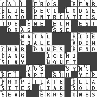 ACROSS 1. Give a ring to 5. Greek god of love 9. Lightbulb-shaped fruit 13. Writer Wiesel 14. Tenth: prefix 15. Cabin 16. Printing process, for short 17. Pleas 19. Third day of the wk. 20. Compass dir. 21. Shade tree 22. Eastern Standard Time (abbr.) 23. To be drawn or hauled along 25. Compass dir. 26. Relating to or accompanying birth 30. Travel on or in a vehicle 34. Peak District village in England 35. An important port of Yemen 36. Burn to charcoal 39. Natives or inhabitants of Denmark 42. Tear apart 43. Mild oath, euphamism for damn 44. Ancient Celtic tribe of eastern Britain 46. Kill 47. Music written for nine 48. Two (Sp.) 51. Synchronize (abbr.) 54. Set 57. Fitting 58. Quiet! 60. Slangy assent 62. Conciliate 65. Rounded earthenware pot or jar 66. Settings 67. One who doesn't tell the truth 68. Exchanged or delivered for money 69. Wither 70. Blunders 71. Singles DOWN 1. An absolute certainty 2. Verbally 3. 61 cubic inches 4. Lion 5. Genesis locale 6. French philosopher Descartes 7. Sep. follower 8. Founders of families 9. Plant holder 10. Singer Brickell 11. Matures 12. Remainder 15. Unable to walk 18. Raised railways 20. Mild oath 24. Disorder of the immune system 27. Bit 28. Chicken ___ king 29. Soviet premier 1918-24 30. Noteworthy scarcity 31. Binary compound 32. Lair 33. Conclusion 36. Music discs 37. Actor Linden 38. Santa ___, CA 40. Environmental prefix 41. Elected rep. 45. Tender 48. Raised platform 49. Choose 50. Vertical member of a panel or frame 52. Thermoplastic polyamide 53. Cell (Danish) 54. Global Positioning Systems (abbr.) 55. One of the Great Lakes 56. Globular water bottle used in Asia 58. Play the lead 59. Possessive pronoun 61. Groovy apts. 63. For each 64. Wind 65. Bear (Spanish)