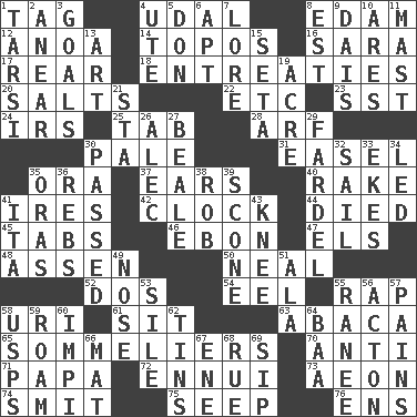 ACROSS 1. Label 4. Hereditary estate 8. Dutch treat 12. Small Philippine buffalo 14. Literary convention 16. "Two Mules for Sister ____" 17. Stern 18. Pleas 20. Table seasonings 22. And so on (abbr.) 23. Fast jet (abbr.) 24. Big collection agency 25. Bar bill 28. Sandy's bark 30. Diluted with white 31. Artist's stand 35. Mouth or opening 37. Hearing organs 40. Libertine 41. Angers 42. Timepiece 44. Passed on 45. Bar bills 46. Inky black, to poets 47. Raised railways 48. NE Netherlands city 50. Actress Patricia 52. Two (Sp.) 54. Snakelike fish 55. Reproach for some lapse or misdeed 58. RI univ. 61. Be seated 63. Phillipine bananalike plant 65. Wine waiters 70. Opposed to 71. Dad 72. World-weariness 73. A really long time 74. Stricken, poetically 75. Ooze 76. Followers of ems DOWN 1. Tarsus (plural) 2. Approach 3. Finish lines 4. Shoshoni 5. Spanish title 6. Fitting 7. Old wives' tales, e.g. 8. Eastern Standard Time (abbr.) 9. Raised platform 10. Ancient Greek god of war 11. Vertical spar for supporting sails 13. Tate display 15. Stalk of a moss capsule 19. 43,560 square feet 21. R.R. building 26. Actor Baldwin 27. Calif. Air Force Base 29. Burden 30. Went by 32. Move on water 33. Supplements with great effort 34. Directed 35. Mouths or openings 36. Confederate soldiers (slang) 38. Director Reiner 39. Biscuitlike quick bread 41. Call ___ day 43. Leg joint 49. Characteristic smell of wine 51. Insect wing 53. Filth; sediment 55. Indian princess (variant) 56. NE Massachussets city 57. Aches 58. United States Postal Service (abbr.) 59. Wander aimlessly 60. Body of Kaffir warriors 62. Metal containers 64. Sound made by sheep 66. Floor protector 67. Compass dir. 68. Regret 69. Small drink