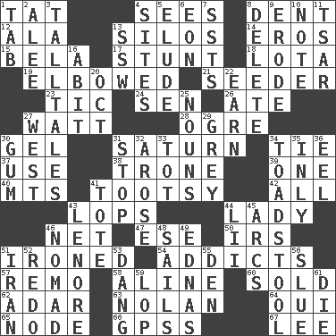 ACROSS 1. Make lace 4. Observes 8. Undesirable depression on a surface 12. In the manner of 13. Grain storage towers 14. Greek god of love 15. Actor Lugosi 17. Difficult or unusual or dangerous feat 18. Globular water bottle used in Asia 19. Shoved, as through a crowd 21. Sowing specialist 23. Nervous spasm 24. Elected rep. 26. Had dinner 27. Electrical Unit 28. Legendary monster 30. Set 31. Titan orbits this 34. Make a knot 37. Purpose 38. Marketplace scale 39. Single 40. Mountains (abbr.) 41. A girl or young woman (variant) 42. 100% 43. Chops off 44. Kenny Rogers chart-topper in '80 46. Fish or hair follower 47. Compass dir. 50. Big collection agency 51. Pressed 54. Inveterate users 57. San ____ (Riviera town) 58. Place in a line 60. Disposed of to a purchaser 62. The sixth month of the Jewish calendar 63. Pitcher Ryan 64. Fr. "Yes" 65. Connecting point 66. Global Positioning Systems (abbr.) 67. Area sheltered from the wind DOWN 1. Bar bill 2. Toward shelter 3. Baron Munchausen's specialties 4. Settings 5. Dodge 6. Period of immesurable duration 7. Fast planes 8. Erase 9. Eat (away) 10. Observe 11. Russian ruler of old 13. Compass dir. 16. "This won't hurt ____!" 20. Sep. follower 22. Merit 25. Parts of speech 27. 270 degrees 29. Jennifer or Joel 30. Chewing product 31. Halt 32. Came up 33. Small child 34. Inedible or poisonous agaric 35. In an inward manner 36. Snakelike fish 41. Carryall 43. Poe poem 44. Cards in a Roman deck? 45. Arches 46. Wanderer 48. Travels by water 49. Ferber et al. 51. SW Asia republic 52. Make new 53. Mild oath, euphamism for damn 55. Lair 56. Turn sharply 59. Trim (branches) 61. Pass on