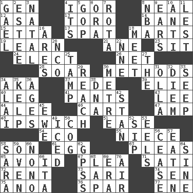 ACROSS 1. Commissioned military rank (abbr.) 4. Russian composer Stravinsky 8. Anneal 12. White ___ sheet 13. "Corrida" creature 14. Object of repulsion 15. Singer James 17. Argument over a trivial matter 18. Shops 19. Memorize 21. A saturated hydrocarbon 23. Be seated 24. Choose 26. Remaining after all deductions 28. Fly high 30. Modes 34. Alias (abbr.) 37. Ancient Persian 39. Writer Wiesel 40. Part of a journey 41. Leg coverings 43. Area sheltered from the wind 44. Toward shelter 46. Haul 47. Electrical Unit 48. NE Massachusetts town 51. Comfort 54. Environmental prefix 55. Sibling's daughter 58. Male child 61. Ovum 63. Entreaties 65. Stay clear from 67. Entreaty 71. Suttee (variant) 72. Monthly bill 73. Indian skirt 74. Elected rep. 75. Small Philippine buffalo 76. Coast Guard woman 77. Compass dir. DOWN 1. Highlander 2. First name in cosmetics 3. Relating to or accompanying birth 4. It is 5. Grand Old Party 6. Mouth or opening 7. Round or rotation of duties 8. Basketball assoc. 9. Hearing organs 10. Opposed to 11. For fear that 16. Ancient Greek god of war 18. Rendezvous 20. Non-commissioned officer (abbr.) 22. Compass dir. 25. Pack (down) 27. Definite Article 29. Arrive at 30. Distance measurement (Brit.) 31. Water jar 32. South Vietnam president (1954) 33. Ooze 34. Jai ____ 35. Seaweed 36. Ripens 38. Heredity factor (abbr.) 42. Comedian Laurel of Laurel & Hardy 45. She-sheep 49. On the rocks 50. Gear tooth 52. Small drink 53. Snakelike fish 56. Stop 57. Eroded 58. "Two Mules for Sister ____" 59. Baking chamber 60. Words to Nanette 62. Global Positioning Systems (abbr.) 64. Trig term 66. Call ___ day 68. Pet locale 69. Epoch 70. Atmosphere