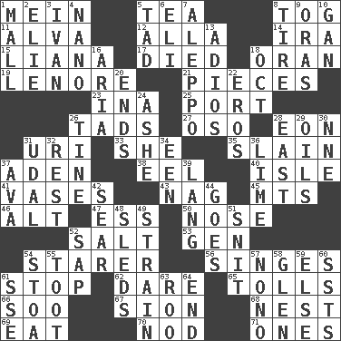 ACROSS 1. Chow _ 5. Afternoon social gathering 8. Coat; cloak 11. Inventor's middle name 12. Silent film actress Nazimova 14. Lyricist Gershwin 15. Climbing, woody, usually tropical vines 17. Passed on 18. NW Algerian seaport 19. Poe poem 21. Parts 23. _ tizzy (2 wds.) 25. Sweet dark-red dessert wine 26. Small boys 27. Bear (Spanish) 28. A really long time 31. RI univ. 33. A female animal or person 35. Killed 37. An important port of Yemen 38. Snakelike fish 40. Small island 41. Flower holders 43. Tired old horse 45. Mountains (abbr.) 46. Keyboard modifier key 47. Double-curved letter 50. Characteristic smell of wine 52. Table seasoning 53. Commissioned military rank (abbr.) 54. A viewer who gazes fixedly 56. Scorches 61. Obstruct or block passage 62. Have the gumption 65. For Whom the Bell _____ 66. "Barney Miller" actor Jack 67. The Jewish people; Israel 68. Egg locale 69. Erode 70. Dreamland 71. Washington bills DOWN 1. Shopping center 2. Writer Wiesel 3. _ the terrible 4. Billionth: prefix 5. Bit 6. Biblical high priest 7. City in Syria 8. Become fatigued 9. Mouths or openings 10. Separate the seeds from cotton 13. Goodbye (Sp.) 16. Roberta Peters solo 18. Sep. follower 20. Conclusions 22. Greek god of love 24. American tennis player Robert 26. Prong on a fork 28. 90 degrees 29. Lubricates 30. Compass dir. 31. Freehold land 32. Repose 34. Car or cant ending 36. Citrus frut 37. Actress Gardner 39. Long (Scottish) 42. Singe 44. Travels 48. Bobsleighs 49. Put through a sieve 51. In a ____ (agitated or irritated) 52. Plant excrement 54. Portico 55. A blast of a horn 57. Words to Nanette 58. Small, secluded valley 59. Otherwise 60. Fast planes 61. Compass dir. 63. Friend of Pooh 64. Conclude