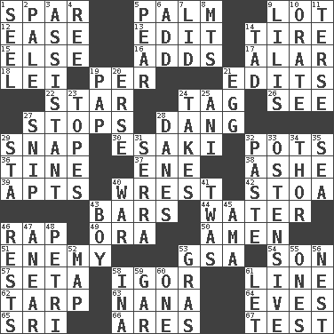 ACROSS 1. Practice fight 5. Inside of hand 9. Car dealer's back yard 12. Comfort 13. Prepare for publication 14. Become fatigued 15. Otherwise 16. Does sums 17. Having or resembling wings 18. Luau accessory 19. For each 21. Prepares for publication 22. Play the lead 24. Label 26. Perceive with the eye 27. Obstructs or blocks passage 28. Mild oath, euphamism for damn 29. Fastener 30. 1973 Nobel Price Winner (Physics) Leo 32. Plant holders 36. Prong on a fork 37. Compass dir. 38. American tennis player Robert 39. Tenement units (abbr.) 40. Take or capture by force 42. Portico 43. Long, evenly shaped pieces 44. Wetness 46. Strike 49. Mouth or opening 50. So be it 51. Foe 53. Girls' org. (abbr.) 54. Male offspring 57. Bristle 58. Composer Stravinsky 61. Actor's bit 62. Canvas cover 63. Nanny 64. Nights before holidays 65. _ Lanka 66. Ancient Greek god of war 67. Trial DOWN 1. Sew up the eyelids of hawks and falcons 2. Diluted with white 3. Helper 4. To sift 5. Lightbulb-shaped fruit 6. Say or write further 7. Flaplike covering 8. Mountains (abbr.) 9. Ms. Damita and namesakes 10. Declaim 11. Laconic 14. Small boy 19. Infant food 20. Celtic language 21. Ovum 23. Drinks excessively 24. Proceeds 25. Cuckoo 27. Sever or remove by pinching or nipping 28. Natives or inhabitants of Denmark 29. R.R. building 31. Spanish missionary in California 32. Thick mixture 33. Clearly or manifestly demonstrative 34. Son of Odin 35. Ocean 40. Armed conflict 41. It was, poetically 43. Male child 45. Housemaid (var.) 46. Musical pauses 47. Approach 48. _ dish (used to culture cells) 52. Atlas unit 53. Pate de foie ____ 55. Washington bills 56. Egg locale 58. _ tizzy (2 wds.) 59. Slender fish 60. Single 61. Allow