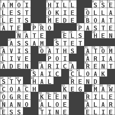 ACROSS 1. Mine, in Marseilles 5. Land elevation 9. Compass dir. 12. For fear that 13. Migrant worker of the '30s 14. Rounded earthenware pot or jar 15. Allows 16. Ancient Persian 17. Water vessel 18. Had dinner 19. Adept person 21. Thick mixture 22. Nathan's nickname 24. Raised railways 26. Layer 27. Indian state 28. Proofreading order 29. Opinion 30. Profane or obscene expressions 32. Tiny particle 36. Not recorded 37. Luau course 38. Operatic vocal solo 39. An important port of Yemen 40. N. Chile seaport 42. Monthly bill 43. Ketch in the Levant 44. Anything that covers or conceals 46. Filthy place 49. Actor Linden 50. Tear apart 51. Team commander 53. Barrel 54. Opening into something insatiable 57. Legendary monster 58. Peachy ____! 61. Cause heat under the collar 62. Billionth: prefix 63. _ vera 64. Having or resembling wings 65. Curvy letter 66. Prong on a fork 67. Writer Wiesel DOWN 1. Silent film actress Nazimova 2. Confront 3. Clearly or manifestly demonstrative 4. It is 5. Like (prefix) 6. Eisenhower's nickname 7. Flaplike covering 8. Area sheltered from the wind 9. Splash clumsily 10. Chalkboard 11. Consumed 14. Chief or king in Benin or Nigeria 19. Parent Teacher Assoc. 20. San ____ (Riviera town) 21. Pacific Standard Time (abbr.) 23. NE Netherlands city 24. Value system 25. French article 27. Enthusiastic 28. Unemotional 29. Chicken ___ king 31. Showery time 32. Composer Copland 33. Excercise machine 34. Pig sound 35. Floor covering 40. American Automobile Association (abbr.) 41. Measure of real estate 43. Quiet! 45. Part of a journey 46. Biscuitlike quick bread 47. Ancient Roman robes 48. Entertaining tales 52. Corporate head (abbr.) 53. Leg joint 55. Jai _ 56. We are 58. Krazy ___ of comics 59. Connecticut Ivy Leaguer 60. Period of immesurable duration 61. Actress Charlotte