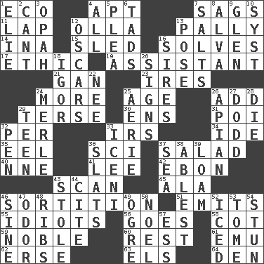ACROSS 1. Environmental prefix 4. Fitting 7. Droops 11. Pet locale 12. Spanish pot 13. Friendly 14. _ tizzy (2 wds.) 15. Downhill vehicle 16. Finds the solution 17. Value system 19. Helper 21. Separate the seeds from cotton 23. Angers 24. Greater amount 25. Mature 26. Find the sum of 29. Laconic 30. Followers of ems 31. Luau course 32. For each 33. Big collection agency 34. Binary compound 35. Snakelike fish 36. _-fi 37. Vegetable dish 40. Compass dir. 41. Area sheltered from the wind 42. Inky black, to poets 43. Examine hastily 45. Chicken ___ king 46. Drawing lots 51. Sends forth 55. Foolish or stupid persons 56. Leaves 58. Small bed 59. Impressive in appearance 60. Relief 61. Australian flightless bird 62. Celtic language 63. Raised railways 64. Lair DOWN 1. Writer Wiesel 2. Patter 3. Brightly colored fish 4. Everything 5. Entreaty 6. Small boys 7. Table seasonings 8. Inventor's middle name 9. Small, secluded valley 10. System (abbr.) 12. Motion picture awards 13. Airs 16. Male parents of animals 18. Russian composer Stravinsky 20. Signals 22. Born 24. Haggard of country music 25. Nest on high 26. Bee-related 27. Texas town _ City 28. Pass on 29. Adolescent 32. Animal enclosure 33. Ancient Celtic tribe of eastern Britain 36. Narrow boards 37. Ocean 38. Most capable 39. Rich soil 43. Fur scarf 44. Quote 46. Trig term 47. Aroma 48. Teases 49. Legendary monster 50. Christmas carol 52. On the rocks 53. Heavy book 54. Astound 57. Curvy letter