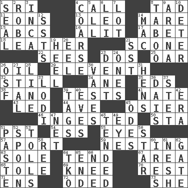 ACROSS 1. _ Lanka 4. Give a ring to 8. Small amount or degree 11. Immeasurably long periods of time 13. Butter sub 14. Female horse 15. Lettered men learn these first 16. Set down 17. Collude with 18. Cordwainer's material 21. Biscuitlike quick bread 22. Perceives with the eye 23. Two (Sp.) 25. Rowing implement 26. Petroleum 29. Veterans Day date 32. Free from disturbance or agitation 34. A saturated hydrocarbon 35. Begley and Asner 38. Papal veil 39. Trials 41. Nathan's nickname 43. Directed 44. "___ Maria" 45. Flexible twig of a willow tree 46. Consumed 50. R.R. building 51. Pacific Standard Time (abbr.) 54. Curvy letter 55. Snake ____ (dice throw) 57. To the left, to Queeg 59. Nestling 63. Flatfish 64. Look after 67. Type of rug 68. Lacquered or enameled metalware 69. Leg joint 70. Respite 71. Followers of ems 72. Wrote a lyric poem 73. A female animal or person DOWN 1. Lick closed 2. Loose flowing garment 3. South American Indian 4. Unrefined 5. 100% 6. Luau accessory 7. Car dealer's back yard 8. Off limits 9. Sports stadium 10. Prevent from occurring 12. Fast planes 14. Apple computer (short form) 19. The bottom of a shoe or boot 20. Snakelike fish 21. Fast jet (abbr.) 23. Undesirable depression on a surface 24. Singles 26. Order of Saint Francis (abbr.) 27. Slanted text style (abbr.) 28. Actor's bit 30. Flower holders 31. Coop moms 33. Farming town in central California 36. Raised platform 37. Proofreading order 39. Labels 40. Nights before holidays 42. Epoch 45. Lyric poems 47. Fish or hair follower 48. Looked after 49. Sight organ 51. Thick mixture 52. Soup utensil 53. For Whom the Bell _____ 56. Play the lead 58. Portuguese money of account (variant) 60. Angers 61. Tender 62. Yard entry 64. Ring climax 65. Conclude 66. Born