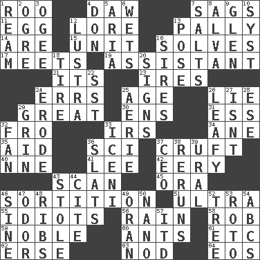 ACROSS 1. Friend of Pooh 4. Simpleton 7. Settles 11. Oval reproductive body of a fowl 12. Old wives' tales, e.g. 13. Friendly 14. "We ___ not amused" (Victoria) 15. A single undivided whole 16. Finds the solution 17. Confronts 19. Aide 21. It is 23. Angers 24. Blunders 25. Ripen 26. Whopper 29. Relatively large 30. Followers of ems 31. Curvy letter 32. From 33. Big collection agency 34. One (Scot) 35. Assist 36. _-fi 37. An unpleasant substance 40. Compass dir. 41. Area sheltered from the wind 42. Suggestive of the supernatural 43. Glance over 45. Mouth or opening 46. Drawing lots 51. Extremist 55. Foolish or stupid persons 56. Water falling in drops from the sky 58. Director Reiner 59. Impressive in appearance 60. Pismires 61. And so on (abbr.) 62. Celtic language 63. Allow head to fall sleepily 64. Greek goddess of the dawn DOWN 1. 480, 500 or 516 sheets of paper 2. Legendary monster 3. Double curve, resembling the letter S 4. Spanish title 5. Roberta Peters solo 6. Moistens 7. Table seasonings 8. Inventor's middle name 9. Small, secluded valley 10. System (abbr.) 12. A period of five years 13. Introduce or present, as a question 16. Founders of families 18. Hoop that covers a wheel 20. Public displays of written messages 22. Fast jet (abbr.) 24. Wear away 25. Nest on high 26. Like summer trees 27. Is not 28. Compass dir. 29. Amused look 32. Avid follower 33. Ancient Celtic tribe of eastern Britain 36. Narrow boards 37. Corporate head (abbr.) 38. Summer TV shows 39. Mountain range 43. Fur scarf 44. Quote 46. Trig term 47. Aroma 48. Chest bones 49. Northwest Algerian city 50. Billionth: prefix 52. Relationship diagram 53. Printing process, for short 54. Lettered men learn these first 57. It would