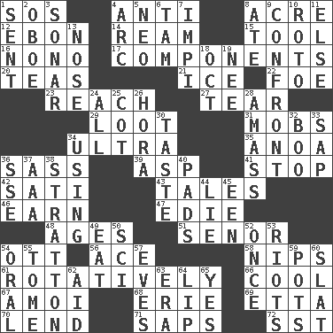 ACROSS 1. Distress signal 4. Against 8. 1/640 square mile 12. Inky black, to poets 14. 480, 500 or 516 sheets of paper 15. Instrument 16. Words to Nanette 17. Parts 20. Afternoon social gatherings 21. Frozen water 22. Enemy 23. Arrive at 27. Rend 29. Spoils 31. Disorderly crowds 34. Extremist 35. Small Philippine buffalo 36. Backtalk 39. Viper 41. Discontinue 42. Suttee (variant) 43. Lies 46. Merit 47. Singer Brickell 48. Matures 51. Sir (Sp.) 54. Baseball player Mel 56. Adept person 58. Pinches, bites 61. Happening in regular succession 66. Calm and collected 67. Mine, in Marseilles 68. 4th largest of the Great Lakes 69. Singer James 70. Grant temporary use of 71. Plant excrements 72. Fast jet (abbr.) DOWN 1. Transmitted 2. Mitch Miller's instrument 3. Underwater navigation system 4. Curve 5. Modern: prefix 6. Scottish cap 7. Body of Kaffir warriors 8. Had dinner 9. Meet 10. Printing process, for short 11. Otherwise 13. Sense of smell 18. Sep. follower 19. Born 24. Everything 25. Small bed 26. Israeli folk dance 28. Collect or gather 30. Clothes sense 32. Surprise greeting 33. Plant excrement 34. Putting into practice 36. Compass dir. 37. American Automobile Association (abbr.) 38. Ski resort town in Vermont 40. Writing tablets 44. Falsehood 45. Car or cant ending 49. Ingest 50. _-fi 52. At one time in the past 53. Debaucheries 54. Of the mouth 55. Heavy book 57. Nights before holidays 59. Plant holders 60. Narrow board 62. Help 63. Epoch 64. Mouth edge 65. Consenting reply