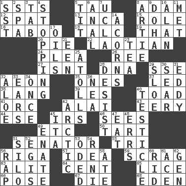 ACROSS 1. Fast planes 5. The 19th letter of the Greek alphabet 8. First of billions? 12. Petty quarrel 13. South American Indian 15. Hero or heavy, e.g. 16. Off limits 18. Baby powder 19. Not this but _ 20. Sliced dessert 22. Of or relating to Laos or its people 24. Entreaty 26. To sift 27. Is not 28. Heredity factor (abbr.) 29. Compass dir. 32. Period of immesurable duration 35. Singles 37. Directed 38. Long (Scottish) 39. French article 40. Frog relative 41. The grampus (Milton) 42. Mountain range southwest of Kyrgyzstan 43. Suggestive of the supernatural 44. Compass dir. 45. Big collection agency 46. Observes 49. And so on (abbr.) 50. Small pie 51. Elected representative 55. Three (prefix) 56. Port city in Latvia 57. It may be bright or harebrained 59. Strangle with an iron collar 63. Set down 64. Penny 65. Louse (plural) 66. Introduce or present, as a question 67. Expire 68. Genesis locale DOWN 1. Fast jet (abbr.) 2. Health resort 3. Bar bill 4. Obstructing or blocking passage 5. Teat (slang) 6. Of or related to the anus 7. Southern CA. univ. 8. Nick name for Arthur 9. Capital of the state of Qatar 10. Actor Alda or Thicke 11. Was introduced to 14. Oak nuts 17. Petroleums 21. Car or cant ending 23. Beverage made from leaves 25. Ringlike coral islands and reefs 28. Cease 29. _ gin 30. Wither 31. Whirlpool 32. Medicinal plant 33. Hearing organs 34. Single time 36. Teachers' org. 40. A testis 42. Northern region 45. Call ___ day 47. Ingest 48. Blunders 49. Maternal 51. Grain storage tower 52. The front part of a cuirass 53. Wrote a lyric poem 54. Painter Guido (1575-1642) 56. Strike 58. Had dinner 60. To free from 61. Adept person 62. Commissioned mil. rank