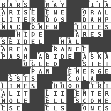 ACROSS 1. Oblong pieces of solid material 5. Can I? 8. Call ___ day 11. Originate 13. Compass dir. 14. Taken by mouth 15. 61 cubic inches 16. Two (Sp.) 17. Moist 18. Apple computer (short form) 19. Sign of something about to happen 21. Lugs 22. Flintstone garb 24. Ancient Greek god of war 25. Beer mug 27. Actor Linden 29. Type of rug 30. Indian princess (variant) 32. Romantic infatuation 33. Remain 35. "____ silly question..." 39. Stared 41. Proofreading order 42. Baking dish 43. Develop 45. Fast planes 48. Root beer relative 49. Citrus fruits 50. Parka part 52. Three (prefix) 55. Set down 56. Cards in a Roman deck? 57. Keyboard key 59. Undercover agent 60. Pipe bend 61. Biscuitlike quick bread 62. Compass dir. 63. Raised railways 64. Washington bills DOWN 1. Lip ointment 2. Operatic vocal solo 3. Actors Guy, Robert Welles, and Clint 4. Compass dir. 5. Ancient Persian 6. Soon (poet.) 7. Affirmative reply 8. Feeling or showing extreme anger 9. Makes less strong or intense 10. High mountains 12. Eat (away) 14. Aroma 20. Cartoonist voice _ Blanc 21. Falsehood 23. Potato state 25. Plant excrement 26. Period 27. Possessed 28. A saturated hydrocarbon 30. To free from 31. Artist's stand 33. According to 34. Benjamin's nick name 36. Ski resort town in Vermont 37. Barrel 38. Had dinner 40. Global Positioning Systems (abbr.) 43. Environmental prefix 44. Methods 45. Grain storage towers 46. Grin 47. False hair 49. Unable to walk 50. Land elevation 51. Lubricates 53. French philosopher Descartes 54. Angers 56. Area sheltered from the wind 58. Non-commissioned officer (abbr.)