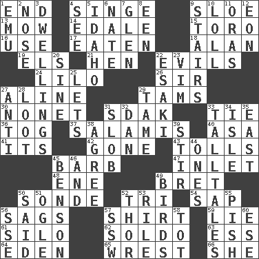 ACROSS 1. Conclude 4. Burn superficially 9. _ gin 13. Cut the grass 14. Peak District village in England 15. "Corrida" creature 16. Purpose 17. Eroded 18. Actor Alda or Thicke 19. Raised railways 21. Layer 22. Vices 24. _ and Stitch 26. Title for a knight 27. Place in a line 29. Scottish caps 30. Music written for nine 31. Neighbor of Neb. 33. Neckwear 36. Coat; cloak 37. Deli grouping 40. White ___ sheet 41. It is 42. Went 43. For Whom the Bell _____ 45. Sharp remark 47. An arm off of a larger body of water 48. Compass dir. 49. Cy Young winner Saberhagen 50. Something which is sent 52. Three (prefix) 54. Plant excrement 56. Droops 57. Upper-body garment 59. Untruth 61. Grain storage tower 62. Twentieth part of a lira 63. Double-curved letter 64. Paradise 65. Take or capture by force 66. A female animal or person DOWN 1. Australian flightless bird 2. Sense of smell 3. Homes 4. Observe 5. Potato state 6. Nathan's nickname 7. Small, secluded valley 8. Car or cant ending 9. Flight of steps 10. Hang loosely or laxly 11. Mouths or openings 12. A really long time 20. Trig term 22. 1973 Nobel Price Winner (Physics) Leo 23. Zeal 25. Allows 27. Against 28. Plunder 29. Not wild 31. Oscar Madison type 32. Daniel's nick name 33. Baron Munchausen's specialties 34. Capri or Wight 35. Compass direction 38. Match 39. Disorderly outburst 44. Washington bills 45. Gillaume's butler role 46. Plus 49. Avian creatures 50. Expressed in words 51. Stare at amorously 52. Son of Odin 53. Cause heat under the collar 55. Expression of disdain 56. Compass dir. 57. Compass dir. 58. Small child 60. Compass dir.