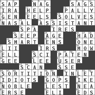 ACROSS 1. Plant excrement 4. Tired old horse 7. Droops 11. Retirement account (abbr.) 12. Assist 13. Friendly 14. Commissioned mil. rank 15. Snakelike fish 16. Finds the solution 17. Relating to the nose 19. Aide 21. Health resort 23. Angers 24. Ooze 25. Grow older 26. Possessed 29. Don Adams' spy role 30. Followers of ems 31. Single 32. Cards in a Roman deck? 33. Big collection agency 34. Cut the grass 35. Pipe bend 36. _-fi 37. Eucharist need 40. Unit of force equal to gravity 41. Area sheltered from the wind 42. One who makes use of a thing 43. Examine minutely or intensely 45. Compass dir. 46. Decision 51. An arm off of a larger body of water 55. Foolish or stupid persons 56. Republicans 58. Mamie's mate 59. Impressive in appearance 60. For fear that 61. Teachers' org. 62. Celtic language 63. Biblical high priest 64. Begley and Asner DOWN 1. Attach a signature 2. Length times width 3. Zero-star reviews 4. Born 5. Silent film actress Nazimova 6. Global Positioning Systems (abbr.) 7. Table seasonings 8. Inventor's middle name 9. Small, secluded valley 10. System (abbr.) 12. Aide 13. Introduce or present, as a question 16. Male parents of animals 18. At sea 20. Omens 22. Fitting 24. Grin 25. Nest on high 26. Home run 27. At once, immediately (arch.) 28. Morning condensation 29. Filth; sediment 32. Part of a journey 33. Ancient Celtic tribe of eastern Britain 36. Narrow boards 37. Fluid product of inflammation 38. Help 39. Adolescent 43. Took without asking 44. Quote 46. Trig term 47. Aroma 48. Chest bones 49. Stare at amorously 50. Christmas carol 52. Actor's bit 53. Supplemented with great effort 54. Afternoon social gatherings 57. 23rd letter of the Greek alphabet