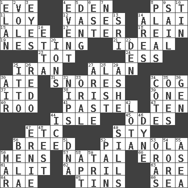 ACROSS 1. Night before a holiday 4. Genesis locale 8. Pacific Standard Time (abbr.) 11. Myrna of the movies 12. Flower holders 14. Jai _ 15. Toward shelter 17. Keyboard key 18. It's straight from the horse's mouth 19. Nestling 21. Standard of perfection 23. Small child 24. Curvy letter 25. SW Asia republic 27. Actor Alda or Thicke 30. Had dinner 31. Sounds asleep 34. Gear tooth 37. It would 38. From or relating to Ireland 39. Single 40. Friend of Pooh 41. Soft color 43. Nine, plus one 44. Capri or Wight 45. Lyric poems 47. And so on (abbr.) 49. Filthy place 50. A special lineage 52. Player piano 56. Not women's 57. Brizilian seaport 60. Greek god of love 61. Came down and settled, as after flight 62. Showery time 63. "We ___ not amused" (Victoria) 64. Actress Charlotte 65. Canisters 66. Ocean DOWN 1. Style 2. Short-tailed, large-bodied rat 3. Snake ____ (dice throw) 4. Happening 5. Mild oath, euphamism for damn 6. Eastern Standard Time (abbr.) 7. Born 8. Entreaties 9. Move on water 10. Metal container 13. _ Lanka 14. Ancient Greek god of war 16. Singer James 20. Charged particles 22. Lair 25. "Tell ____ the Marines!" 26. Do over again 27. Ascend 28. For fear that 29. American tennis player Robert 30. Wind 32. Cuts off 33. Taken by mouth 34. ____ d'Azur (French Riviera) 35. Washington bills 36. Commissioned military rank (abbr.) 42. Globular water bottle used in Asia 44. Frozen water 46. Centimeter-gram-second unit of force 47. Bert's buddy 48. Trial 49. Beverly of Met fame 50. Actor Lugosi 51. Heredity factor (abbr.) 52. Ache 53. Mouths or openings 54. Old wives' tales, e.g. 55. At sea 56. Make imperfect 58. Fitting 59. Three (prefix)