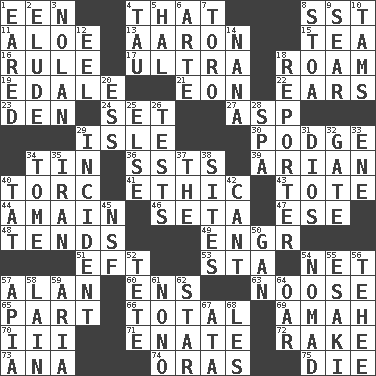 ACROSS 1. Car or cant ending 4. Not this but _ 8. Fast jet (abbr.) 11. _ vera 13. Composer Copland 15. Beverage made from leaves 16. Court order 17. Extreme 18. Wander 19. Peak District village in England 21. Period of immesurable duration 22. Hearing organs 23. Lair 24. Arrange properly for use 27. Cleo's killer 29. Capri or Wight 30. Porridge 34. Shallow baking pan 36. Fast planes 39. Believer in; advocate of (suffix) 40. Torque (variant) 41. Moral principle 43. Carryall 44. At full speed 46. Stalk of a moss capsule 47. Compass dir. 48. Looks after 49. Engineer (abbr.) 51. Bank Draft (abbr.) 53. R.R. building 54. Remaining after all deductions 57. Actor Alda or Thicke 60. Followers of ems 63. Trap for birds or small mammals 65. Component 66. Add up to 69. Wet nurse 70. One more than two 71. Maternal 72. Libertine 73. Santa ___, CA 74. Mouths or openings 75. Expire DOWN 1. Having ears or earlike features 2. Dodge 3. Pitcher Ryan 4. The 19th letter of the Greek alphabet 5. Actor Linden 6. Johnson of "Laugh-In" 7. "Corrida" creature 8. Portico 9. Singe 10. Scottish caps 12. Snakelike fish 14. Grandmother 18. Newsperson 20. Double-curved letter 25. Otherwise 26. Trials 28. Health resort 29. Happening 31. "Vaya con ____" 32. Yard entry 33. Compass dir. 34. Heavy book 35. SW Asia republic 37. Definite Article 38. Locates 40. Make lace 42. Patter 45. Science/research agcy. 50. Separate the seeds from cotton 52. Wig 54. Wanderer 55. 1973 Nobel Price Winner (Physics) Leo 56. Giggle 57. Capital of Western Samoa 58. (Had) reclined 59. Operatic vocal solo 61. Words to Nanette 62. Play the lead 64. Boat paddle 67. "One Day ___ Time" 68. French article