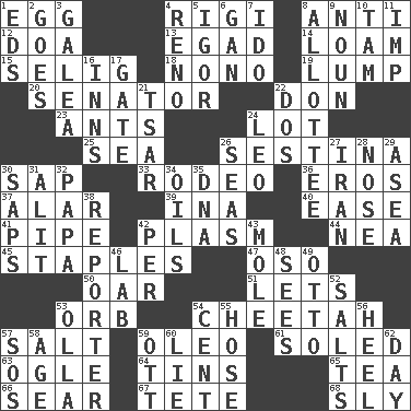 ACROSS 1. Oval reproductive body of a fowl 4. Swiss mountan, "Queen of the Mountains" 8. Against 12. ___ good deed 13. Mild oath 14. Rich soil 15. Major League Baseball Commissioner Bud 18. Words to Nanette 19. Mass 20. Legislator 22. Spanish title 23. Pismires 24. Car dealer's back yard 25. Ocean 26. French poetic form 30. Plant excrement 33. Cowboy competition 36. Greek god of love 37. Having or resembling wings 39. _ tizzy (2 wds.) 40. Comfort 41. Corncob 42. Suffix with ecto or cyto 44. Teachers' org. 45. Paper fasteners 47. Bear (Spanish) 50. Boat paddle 51. Allows 53. Globe 54. Leopard's kin 57. Table seasoning 59. Margarine 61. Having a sole or soles 63. Stare 64. Canisters 65. Afternoon social gathering 66. Burn superficially 67. Wig 68. Wily DOWN 1. Begley and Asner 2. Travels 3. An organ shaped like a helmet 4. Western Nevada city 5. Composer Stravinsky 6. Separate the seeds from cotton 7. Wedding promise 8. One to whom something is allotted 9. Part of speech 10. Scottish cap 11. Naughty child 16. Lodging establishments 17. Yard entry 21. Russian ruler of old 22. Two (Sp.) 24. Lion 26. Oceans 27. SW Asia republic 28. Characteristic smell of wine 29. At sea 30. Plant excrements 31. Came down and settled, as after flight 32. Dad 34. Petroleums 35. Heredity factor (abbr.) 38. Newsperson 42. For each 43. Undercover agent 46. Experiment locale 48. Perceives with the eye 49. Von Bismarck 52. Table seasonings 53. Spanish pot 54. Penny 55. Stockings 56. The bottom of a shoe or boot 57. Distress signal 58. Mature 59. Baseball player Mel 60. Untruth 62. 24 hours
