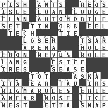ACROSS 1. Expression of disdain 5. Pismires 9. Vintage cars 13. Small island 14. Grant temporary use of 15. Cabin 16. Enthusiasm 17. Form of transportation 19. Put into a specified state 20. Shallow baking pan 21. Globe 22. Snakelike fish 23. Technical work 25. Standoff 26. Failure 30. Russian ruler of old 34. Sports stadium 35. Opening into or through something 36. Inky black, to poets 39. Congenital growth or mark on the skin 42. Hero or heavy, e.g. 43. Long (Scottish) 44. First name in cosmetics 46. Angers 47. Gospel singer Marvin 48. Small child 51. "____ silly question..." 54. Call ___ day 57. Ewer handle 58. The 19th letter of the Greek alphabet 60. Big collection agency 62. Frustrating wastes of time 65. One of the Great Lakes 66. Approach 67. Olfactory organ 68. Louse (plural) 69. A home for chicks 70. Singer James 71. Fastener DOWN 1. Sliced desserts 2. Small island 3. Chalkboard 4. Layer 5. Jai ____ 6. Part of speech 7. Make lace 8. Snob 9. Director Reiner 10. Singer Brickell 11. Stare 12. Sew up the eyelids of hawks and falcons 15. Ear part 18. Medical imaging device (abbr.) 20. Son of Odin 24. Gives out a loud, resonant sound 27. Elected rep. 28. Compass dir. 29. All-night dance parties 30. Threesomes 31. "Barney Miller" actor Jack 32. Everything 33. To sift 36. Biblical high priest 37. Long, evenly shaped piece 38. Single 40. Purpose 41. R.R. building 45. He sold his birthright 48. Rend 49. Rowing implement 50. Heavy duty weighing machine 52. Japanese brewing company 53. N. Chile seaport 54. SW Asia republic 55. Prong on a fork 56. Grows older 58. Trial 59. At sea 61. Ooze 63. Floor covering 64. Car dealer's back yard 65. Raised railways