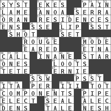 ACROSS 1. System (abbr.) 5. Supplements with great effort 9. Ache 13. Unable to walk 14. Small Philippine buffalo 15. Spanish missionary in California 16. Northwest Algerian city 17. Dwellings 19. Followers of ems 20. Compass dir. 21. Mouth edge 22. Fast jet (abbr.) 23. Went for two points 25. Arrange properly for use 26. Makeup applied to the cheeks 30. Method 34. Having ears or earlike features 35. Inactive volcano in Sicily 36. Give a ring to 39. Empty; void 42. Play the lead 43. Singles 44. Plunders 46. Wig 47. Bert's buddy 48. Compass dir. 51. Inconspicuous attention getter 54. Call ___ day 57. For each 58. One more than two 60. Small child 62. Pieces 65. Corncob 66. Voters do this 67. Lick closed 68. Actor Baldwin 69. Cub Scout units 70. Falsehood 71. Soft DOWN 1. _ gin 2. Tall tales 3. Box-office sellout 4. "___ Little Indians" 5. Hearing organs 6. Leg joint 7. Greek goddess of the dawn 8. Travels by water 9. Fenced enclosure 10. Arches 11. Angers 12. Political cartoonist Thomas 15. Back-to-school mo. 18. Expire 20. Portico 24. Threatening words 27. RI univ. 28. Commissioned military rank (abbr.) 29. Peak District village in England 30. Makes clutter 31. Baseball player Mel 32. Heredity factor (abbr.) 33. Hearing organ 36. Small bed 37. One (Scot) 38. Allow 40. Not either 41. A really long time 45. Native american tent (variation) 48. Specific locale 49. Elected rep. 50. Obtain by seizing forcibly or violently 52. Vertical member of a panel or frame 53. Drinks excessively 54. On the rocks 55. Lacquered or enameled metalware 56. So be it 58. Slanted text style (abbr.) 59. Capri or Wight 61. Technical 63. Personal Computers (abbr.) 64. Teachers' org. 65. Baking dish