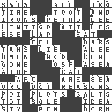ACROSS 1. Fast planes 5. Everything 8. Ring climax 11. Hoop that covers a wheel 12. A blast of a horn 14. Also 15. Metal shackles 17. Stone: prefix 18. Area sheltered from the wind 19. Small, flat, pigmented spot on the skin 21. Small island 22. French article 23. Compass dir. 24. Pet locale 25. Erode 27. Snakelike fish 28. Taverns 31. Scottish caps 35. Falsehood 37. Toward shelter 38. Presage 39. Non-commissioned officer (abbr.) 41. Penny 42. Went 43. Order of Saint Francis (abbr.) 45. At sea 46. Helper 47. Feline 49. Curve 51. "We ___ not amused" (Victoria) 52. Ocean 55. The grampus (Milton) 57. Sep. follower 60. Thinks logically 62. Luau course 63. Small pieces of grounds 65. Table seasonings 66. Small child 67. Not divided or shared with others 68. It may be bright or harebrained 69. Filthy place 70. Animal enclosure 71. Dormintory (informal) DOWN 1. Vertical member of a panel or frame 2. Male parents of animals 3. Heavy duty weighing machine 4. Emitted 5. Had dinner 6. Globular water bottle used in Asia 7. Australian parrot (variant) 8. Baron Munchausen's specialties 9. Leg joint 10. Lyric poems 13. Carryall 16. Filth; sediment 17. Cotton for raincoats, e.g. 20. Highlander 26. Phillipine bananalike plant 29. French philosopher Descartes 30. Stalk of a moss capsule 31. Ancient Roman robe 32. Mine, in Marseilles 33. Ananias' fault 34. Scornful expression 36. Environmental prefix 40. Motion picture awards 44. Conductor's collection 48. Afternoon social gatherings 50. 911 reaches them 52. Twentieth part of a lira 53. Keyboard key 54. Indian state 55. Elects 56. Carrot, for example 58. Hoof sound 59. Lacquered or enameled metalware 61. Expressed in words 64. "___ Little Indians"