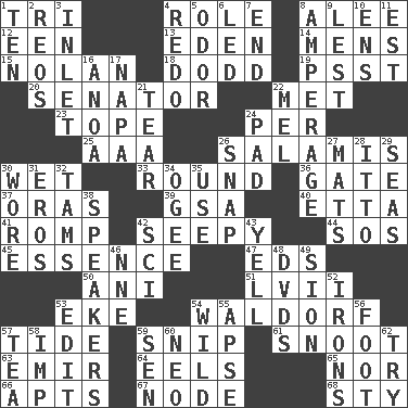 ACROSS 1. Three (prefix) 4. Hero or heavy, e.g. 8. Toward shelter 12. Car or cant ending 13. Locale of original sin 14. Not women's 15. Pitcher Ryan 18. Texas town _ City 19. Inconspicuous attention getter 20. Legislator 22. Was introduced to 23. Drink excessively 24. For each 25. Auto club (abbr.) 26. Deli grouping 30. Soggy 33. One shot 36. Yard entry 37. Mouths or openings 39. Girls' org. (abbr.) 40. Singer James 41. Frolic 42. Not well drained, as in land 44. Distress signal 45. Gist 47. Begley and Asner 50. Cuckoo 51. 57 in ancient Rome 53. Supplement with great effort 54. Apple salad 57. Event that recurs at intervals 59. Sever or remove by pinching or nipping 61. Snob 63. Independent ruler or chieftain 64. Snakelike fish 65. And not 66. Tenement units (abbr.) 67. Thickened enlargement 68. Filthy place DOWN 1. Nine, plus one 2. Vintage cars 3. An arm off of a larger body of water 4. Redecorate 5. Aroma 6. Directed 7. Conclusion 8. Electrical Measurement 9. For fear that 10. Followers of ems 11. Eastern Standard Time (abbr.) 16. Small Philippine buffalo 17. California wine valley 21. Pull apart 22. Cartoonist voice _ Blanc 24. Writing tablet 26. Fastener 27. Floor coverings 28. "Tell ____ the Marines!" 29. Oceans 30. Had on 31. Greek god of love 32. Scottish caps 34. Double curve, resembling the letter S 35. Purpose 38. Orators 42. _-fi 43. Shout 46. Compass dir. 48. Movie discs 49. The Jewish people; Israel 52. Metal shackles 53. Prepare for publication 54. Rampant 55. Domed church section 56. 12 inches 57. Beverage made from leaves 58. Naughty child 59. Elected rep. 60. Modern: prefix 62. Attempt to accomplish something