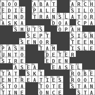 ACROSS 1. Sometimes accompanies a hiss 4. Blind as ____ 8. Bowlike part 12. Singer Brickell 14. Diluted with white 15. Grain storage tower 16. Grant temporary use of 17. Interpreter 20. "____ silly question..." 21. ___ good deed 22. Tax preparer (abbr.) 23. Particles of soot 27. Brightly colored fish 29. Back-to-school mo. 31. Signal 34. Sir (Sp.) 35. Adolescent 36. Romantic infatuation 39. Scottish cap 41. Capri or Wight 42. To (old English) 43. Prevent from occurring 46. Father 47. Paradise 48. At sea 51. Artist's stand 54. Make lace 56. What Jean-Claude Killy likes to do 58. Loose flowing garment 61. Pleas 66. Carrot, for example 67. Portico 68. Carry 69. Comedian Laurel of Laurel & Hardy 70. Prong on a fork 71. At one time in the past 72. R.R. building DOWN 1. Actor Lugosi 2. Lyric poems 3. Pig sounds 4. Fitting 5. Long, evenly shaped piece 6. In the manner of 7. Be inclined (to) 8. White ___ sheet 9. Actors Guy, Robert Welles, and Clint 10. Hoof sound 11. Israeli folk dance 13. Dutch treat 18. "Barney Miller" actor Jack 19. Infant locale 24. Purpose 25. Nine, plus one 26. Blemish 28. Being in motion 30. Exchange 32. Set 33. Compass dir. 34. Imelda's hoard 36. Fluid product of inflammation 37. Cuckoo 38. Ski resort town in Vermont 40. Ancient Persian 44. Afternoon social gathering 45. Followers of ems 49. Compass dir. 50. Alias (abbr.) 52. Blunders 53. Plunders 54. Trial 55. Opposed to 57. "Tell ____ the Marines!" 59. Water vessel 60. Inactive volcano in Sicily 62. Actress Charlotte 63. Electrically charged atom 64. And so on (abbr.) 65. Observe