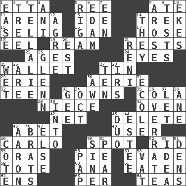 ACROSS 1. Singer James 5. To riddle 8. Had dinner 11. Sports stadium 13. Binary compound 14. Long journey 15. Former Milwaukee Brewers owner Bud 16. Separate the seeds from cotton 17. Flexible conduit 18. Snakelike fish 19. 480, 500 or 516 sheets of paper 21. Musical pauses 22. Matures 24. Snake ____ (dice throw) 25. Place for singles 27. Shallow baking pan 29. 4th largest of the Great Lakes 30. Nest on high 32. Adolescent 33. Women's formal wear 35. Root beer relative 39. Sibling's daughter 41. Baking chamber 42. Remaining after all deductions 43. Erase 45. Collude with 48. One who makes use of a thing 49. Monte _, Las Vegas Hotel/Casino 50. Blemish 52. To free from 55. Mouths or openings 56. Sliced dessert 57. Elude 59. Haul 60. Santa ___, CA 61. Ingested 62. Followers of ems 63. For each 64. Beverages made from leaves DOWN 1. Relaxation 2. Relationship diagram 3. Copy Pinocchio 4. Cuckoo 5. Capital of Latvia 6. Dutch treat 7. Car or cant ending 8. Came up 9. Trials 10. Makes supply last 12. Match 14. Those people 20. Eastern Standard Time (abbr.) 21. Painter Guido (1575-1642) 23. American astronaut and politician John 25. Soggy 26. "We ___ not amused" (Victoria) 27. Nine, plus one 28. Big collection agency 30. Deep reverence 31. Learning spot: Fr. 33. Turn to the right 34. Sep. follower 36. Make much ado about nothing 37. Allow 38. One (Scot) 40. To the inside or interior of 43. Superhero pair 44. First name in cosmetics 45. Composer Copland 46. Naughty children 47. Otherwise 49. ____ d'Azur (French Riviera) 50. Trig term 51. Lightbulb-shaped fruit 53. The main thing one is thinking about 54. Habitations of wild animals 56. Infant food 58. Large container