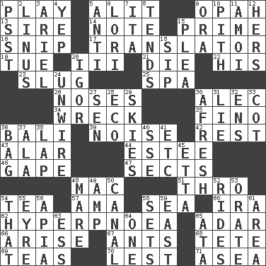ACROSS 1. Live dramatic performance 5. Set down 9. Brightly colored fish 13. Father 14. Brief written record 15. A-one 16. Clip 17. Interpreter 19. Third day of the wk. 20. One more than two 21. Pass on 22. Part of HMS, perhaps 23. Strike heavily 25. Health resort 26. Olfactory organs 30. Actor Baldwin 34. Raze 35. Fine (Spanish) 36. Indonesian resort city 39. Annoying sound 42. Repose 43. Having or resembling wings 44. First name in cosmetics 46. Open wide 47. Religious groups 48. Big _ 51. Through, poetically 54. Afternoon social gathering 57. Wet nurse (var.) 58. Ocean 60. Retirement account (abbr.) 62. Abnormally rapid or deep breathing 65. The sixth month of the Jewish calendar 66. Ascend 67. Pismires 68. False hair 69. Beverages made from leaves 70. For fear that 71. At sea DOWN 1. Inconspicuous attention getter 2. "_ and Lucy" (Charlie Brown theme song) 3. Satellite of Uranus 4. Slangy assent 5. Against 6. Australian parrot (variant) 7. Call ___ day 8. Looks after 9. Mouth or opening 10. Essential or central part 11. Mine, in Marseilles 12. Possessive pronoun 15. Entreaty 18. Small drink 20. Composer Stravinsky 24. Undo the wiring of 27. Elected rep. 28. Environmental prefix 29. Atmospheres 30. Anew 31. Whopper 32. Followers of ems 33. Small bed 36. Paper or plastic container 37. According to 38. Infant locale 40. Compass dir. 41. And so on (abbr.) 45. Singer James 48. Female horse 49. Electrical Unit 50. Lessep's creation 52. Amusement-park features 53. Declaim 54. Not this but _ 55. Jane of fiction 56. Capital of Western Samoa 58. Puts into a specified state 59. Compass direction 61. Length times width 63. Double-curved letter 64. Single 65. _ moment's notice (2 wds.)
