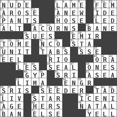 ACROSS 1. Unadorned 5. Unable to walk 9. Opposite of masc. 12. Came up 14. Afresh 15. Binary compound 16. Leg coverings 17. Stockings 18. Directed 19. Keyboard modifier key 20. Oak nuts 23. Object of repulsion 24. Takes to court 25. Independent ruler or chieftain 27. Heavy book 30. Non-commissioned officer (abbr.) 32. R.R. building 33. A single undivided whole 34. Bar bills 36. Compass dir. 38. Snakelike fish 39. River (Sp.) 40. Mouth or opening 43. French article 46. Lick closed 48. Washington bills 49. Con 51. _ Lanka 52. Toward the sea 53. Pale green bean 54. Engineer (abbr.) 56. Indian titles of respect 58. Sowing specialist 61. Small amount or degree 64. 54 in ancient Rome 65. Play the lead 66. Ancient Celtic tribe of eastern Britain 68. Ripen 69. Possessive pronoun 70. Brizilian seaport 71. Prohibit 72. Otherwise 73. Shout DOWN 1. California wine valley 2. Mountain range 3. Do not 4. Eastern Standard Time (abbr.) 5. Cowardly lion portrayer 6. Soon (poet.) 7. Makes clutter 8. She-sheep 9. Having threads 10. Paradise 11. Ancient Persian 13. Son of Isaac 21. Penny 22. Motion picture awards 23. Prejudice 24. Put into a specified state 26. Mountains (abbr.) 27. Third day of the wk. 28. Single 29. Place where flour is made 31. Off-Broadway awards 35. Flew 37. Immeasurably long periods of time 41. To separate or throw off 42. White ___ sheet 44. Armor plate that protects the chest 45. Symbol (abbr.) 47. Actor's bit 48. Rowing implement 50. Soft color 53. Make or become more lively 55. Broad smile 56. Thick slice 57. Capital of Latvia 59. Hearing organs 60. Celtic language 61. False hair 62. Of or related to the anus 63. Deli pickle 65. A female animal or person 67. Island