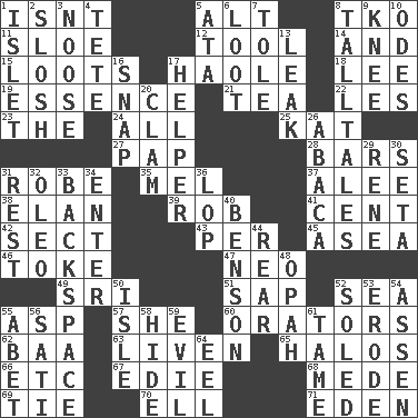 ACROSS 1. Is not 5. Keyboard modifier key 8. Ring climax 11. _ gin 12. Instrument 14. Added to 15. Plunders 17. White Person, in Hawaii 18. Area sheltered from the wind 19. Center 21. Afternoon social gathering 22. French article 23. Definite Article 24. Everything 25. Krazy ___ of comics 27. Infant food 28. Oblong pieces of solid material 31. Loose flowing garment 35. Cartoonist voice _ Blanc 37. Toward shelter 38. Flair 39. Director Reiner 41. Penny 42. Religious group 43. For each 45. Toward the sea 46. Puff or smoke 47. Modern: prefix 49. _ Lanka 51. Plant excrement 52. Ocean 55. Viper 57. A female animal or person 60. Speakers 62. Sound made by sheep 63. Make or become more lively 65. Saint headwear 66. And so on (abbr.) 67. Singer Brickell 68. Ancient Persian 69. Standoff 70. Pipe bend 71. Locale of original sin DOWN 1. Small island 2. Splash clumsily 3. Trap for birds or small mammals 4. False hair 5. "One Day ___ Time" 6. Plunder 7. Lacquered or enameled metalware 8. Baron Munchausen's specialties 9. Leg joint 10. Lyric poems 13. Path through which fluid escapes 16. Fastener 17. Assistant 20. Dollar (slang) 26. Phillipine bananalike plant 29. French philosopher Descartes 30. Stalk of a moss capsule 31. Relief 32. Margarine 33. Keyboard key 34. Keyboard key 36. Chop off 40. Gillaume's butler role 44. Hitchcock's "____ Window" 48. Brightly colored fish 50. Capri or Wight 52. Having a sole or soles 53. Wear away 54. NE Netherlands city 55. Collude with 56. Suttee (variant) 58. Flintstone garb 59. Tending to cause great harm 61. Not wild 64. Snakelike fish