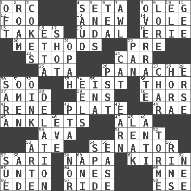 ACROSS 1. The grampus (Milton) 4. Bristle 8. Cassini of fashion 12. Egg _ yung 13. Afresh 14. Grand slam 15. Proceeds 18. Allodial 19. One of the Great Lakes 20. Modes 22. Before (prefix) 23. Discontinue 24. 4-wheeled motor vehicle 25. "One Day ___ Time" 26. Flamboyance 30. "Barney Miller" actor Jack 33. Robbery 36. Son of Odin 37. Among 39. Followers of ems 40. Hearing organs 41. French philosopher Descartes 42. Food holder 44. Actress Charlotte 45. Short socks 47. Chicken ___ king 50. Actress Gardner 51. Monthly bill 53. Had dinner 54. Elected representative 57. Indian skirt 59. California wine valley 61. Japanese brewing company 63. To (old English) 64. Washington bills 65. Madame (abbr.) 66. Paradise 67. Travel on or in a vehicle 68. Compass dir. DOWN 1. Often (poetically) 2. Wander 3. Popular sodas 4. Saudi Arabian king (1953-1964) 5. Extremities 6. Beverage made from leaves 7. Leather borer 8. Make much ado about nothing 9. Old wives' tales, e.g. 10. Connecticut Ivy Leaguer 11. Unit of force equal to gravity 16. Singer James 17. Guess 21. Brightly colored fish 22. Baking dish 24. Domesticated feline 26. Inconspicuous attention getter 27. Burn to charcoal 28. Israeli folk dance 29. Celtic language 30. "Two Mules for Sister ____" 31. Presage 32. Pig sound 34. Snakelike fish 35. _ tizzy (2 wds.) 38. Conveyance 42. Parent Teacher Assoc. 43. Merit 46. First lady 48. Path through which fluid escapes 49. Against 52. Singer Mel 53. Johnson of "Laugh-In" 54. Broke a traffic law 55. Relaxation 56. Basketball hoops 57. Institute legal proceedings 58. Added to 59. Not either 60. Cuckoo 62. Born