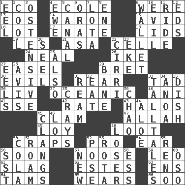 ACROSS 1. Environmental prefix 4. Learning spot: Fr. 9. Past tense of be (plural) 13. Greek goddess of the dawn 14. Make _____ (do battle with) 15. Enthusiastic 16. Car dealer's back yard 17. Maternal 18. Hats (slang) 19. French article 21. White ___ sheet 22. Cell (Danish) 24. Be tempered by heat 26. Mamie's husband 27. Artist's stand 29. Cy Young winner Saberhagen 30. Vices 31. Tail end 33. Small boy 36. 54 in ancient Rome 37. Pertaining to the sea 40. Black tropical American cuckoo 41. Compass dir. 42. Assign a rank or rating to 43. Rings 45. Dollar (slang) 47. Assad's deity 48. Myrna of the movies 49. Plunder 50. Dice game 52. Adept person 54. Hearing organ 56. Within a short period 57. Trap for birds or small mammals 59. Lion 61. Volcanic refuse 62. _____ Park, CO 63. Followers of ems 64. Scottish caps 65. Puts on (as clothing) 66. "Barney Miller" actor Jack DOWN 1. Snakelike fish 2. Calm and collected 3. Clearly or manifestly demonstrative 4. She-sheep 5. Lessep's creation 6. Mouths or openings 7. Globular water bottle used in Asia 8. Compass dir. 9. Place for singles 10. Morally bad or wrong 11. Travel on an animal 12. Begley and Asner 20. Sew up the eyelids of hawks and falcons 22. High-altitude cloud 23. Supplement with great effort 25. In addition 27. Snakelike fish 28. Deliberation 29. Object of repulsion 31. 480, 500 or 516 sheets of paper 32. Consume 33. Baron Munchausen's specialties 34. Small Philippine buffalo 35. Food container 38. Trading vessels 39. US Secretary of Labor Elaine L. _ 44. _ vera 45. Rings loudly 46. Chop off 49. Failure 50. Root beer relative 51. Wander aimlessly 52. Introduce or present, as a question 53. Round or rotation of duties 55. Former U.S. Attorney General Janet 56. Fast jet (abbr.) 57. ___ Haven, CT 58. Curvy letter 60. Bear (Spanish)