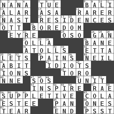 ACROSS 1. Grandmother 5. Third day of the wk. 8. Indonesian resort city 12. Having or resembling wings 13. White ___ sheet 14. Less widely known 15. Political cartoonist Thomas 16. Dwellings 19. Baseball player Mel 20. Mood resulting from idleness 21. Jane of fiction 23. Bear (Spanish) 24. Separate the seeds from cotton 27. Water jar 30. Object of repulsion 31. Ringlike coral islands and reefs 34. Singer James 35. Allows 38. Aches 40. Famous astronaut Armstrong 41. "This won't hurt ____!" 42. Foolish or stupid persons 44. Charged particles 45. "Corrida" creature 46. Compass dir. 47. Distress signal 50. A single undivided whole 53. Heighten or intensify 57. Actress Charlotte 59. Supplementary 63. Root beer relative 64. First name in cosmetics 65. Baking dish 66. Washington bills 67. Separate forcefully 68. Conclusion 69. Inconspicuous attention getter DOWN 1. Billionth: prefix 2. Having winglike extensions 3. Thoroughly unpleasant 4. Tate display 5. Edible starchy tuberous root 6. One who makes use of a thing 7. Comfort 8. Forbid 9. Curve 10. Area sheltered from the wind 11. Big collection agency 14. San ____ (Riviera town) 17. Wedding promise 18. Two (Sp.) 20. Waist strap 22. Exposes to great heat 24. Yard entry 25. Against 26. Actress Patricia 28. Chop off 29. Jai ____ 30. Gillaume's butler role 32. Flaplike covering 33. In a ____ (agitated or irritated) 35. (Had) reclined 36. Inky black, to poets 37. Prong on a fork 39. "Barney Miller" actor Jack 43. Loyal 47. Filth; sediment 48. Single 49. Fast jet (abbr.) 51. Metal shackles 52. Falsehoods 54. Corncob 55. _ the terrible 56. Tear apart 58. Compass direction 59. Put into a specified state 60. Purpose 61. Parent Teacher Assoc. 62. For each 63. Police officer (slang)