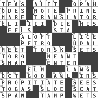 ACROSS 1. Afternoon social gatherings 5. Set down 9. Brightly colored fish 13. Lyric poems 14. Musical sound 15. First class 16. Female horse 17. Interpreter 19. Connecticut Ivy Leaguer 20. One more than two 21. Pass on 22. Part of HMS, perhaps 23. Snakelike fish 25. R.R. building 26. High up in or into the air 30. Louse (plural) 34. Stone: prefix 35. Freehold land 36. Rendezvous 39. Cod relative 42. Puts into a specified state 43. "Corrida" creature 44. Intended 46. Fastener 47. Keyboard key 48. Shade tree 51. Austrian-born American filmmaker Fritz 54. Sep. follower 57. Thick or sticky substance 58. Leather borer 60. Big collection agency 62. Appease 65. Perceives with the eye 66. Ancient Roman robes 67. A type of plum 68. Go away! 69. Connect, as a bridge 70. Pack (down) 71. Soaks DOWN 1. Heavy book 2. Peak District village in England 3. Nest on high 4. Compass dir. 5. Against 6. Australian parrot (variant) 7. Call ___ day 8. Looks after 9. Mouth or opening 10. Essential or central part 11. Mine, in Marseilles 12. Possessive pronoun 15. Entreaty 18. Be seated 20. Small island 24. Portable computer 27. Baseball player Mel 28. Back 29. Singer Mel 30. A period of five years 31. Binary compound 32. Domesticated feline 33. Raised railways 36. Mountains (abbr.) 37. A really long time 38. Period 40. Elected rep. 41. Krazy ___ of comics 45. 1994 drama film starring Jodie Foster 48. The front part of a cuirass 49. Car dealer's back yard 50. Wet 52. Sibling's daughter 53. Relatively large 54. Elects 55. Riding implement 56. Ancient Roman robe 58. Smallest unit of an element 59. Shed a tear 61. Fast planes 63. Baking dish 64. Chicken ___ king 65. Compass dir.