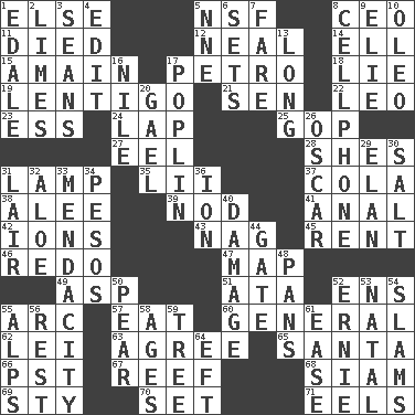 ACROSS 1. Otherwise 5. Overdraft (abbr.) 8. Corporate head (abbr.) 11. Passed on 12. Actress Patricia 14. Pipe bend 15. At full speed 17. Stone: prefix 18. Whopper 19. Small, flat, pigmented spot on the skin 21. Elected rep. 22. Lion 23. Double-curved letter 24. Infant locale 25. Republican Party 27. Snakelike fish 28. "______ My Girl" (Turtles hit) 31. Desk light 35. Cards in a Roman deck? 37. Root beer relative 38. Toward shelter 39. Dreamland 41. Of or related to the anus 42. Charged particles 43. Tired old horse 45. Monthly bill 46. Redecorate 47. Atlas unit 49. Cleo's killer 51. _ moment's notice (2 wds.) 52. Followers of ems 55. Curve 57. Erode 60. Commissioned military rank 62. Flowery wreath 63. Match 65. Before Barbara or Clara 66. Pacific Standard Time (abbr.) 67. Coral collection 68. Thailand, formerly 69. Filthy place 70. Put into a specified state 71. Snakelike fish DOWN 1. Peak District village in England 2. Citrus fruits 3. Actors Connery and Penn 4. Prepare for publication 5. Compass dir. 6. Puts into a specified state 7. Conductor's collection 8. Portable communications device 9. Writer Wiesel 10. Butter sub 13. Protracted 16. The longest river in the world 17. Cotton for raincoats, e.g. 20. Highlander 26. Witty Wilde 29. Flair 30. Table seasoning 31. Den 32. Medicinal plant 33. Ananias' fault 34. Mexican monetary units 36. Electrically charged atom 40. Break 44. Yard entry 48. Zero-star reviews 50. Lightbulb-shaped fruit 52. Bert's buddy 53. Brizilian seaport 54. Shuts with force 55. High mountains 56. Take ten 58. Eons 59. Relationship diagram 61. Comfort 64. Bank Draft (abbr.)