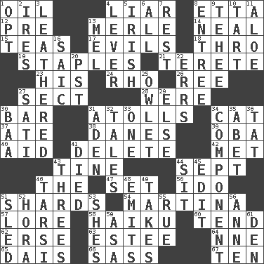 ACROSS 1. Lubricate 4. One who doesn't tell the truth 8. Singer James 12. Before (prefix) 13. Haggard of country music 14. Actress Patricia 15. Beverages made from leaves 17. Vices 18. Through, poetically 19. Paper fasteners 21. Cylindrical with tapered ends 23. Part of HMS, perhaps 24. 17th letter of the Greek alphabet 26. Portuguese money of account (variant) 27. Religious group 28. We are 30. Tavern 31. Ringlike coral islands and reefs 34. Feline 37. Had dinner 38. Natives or inhabitants of Denmark 39. Chief or king in Benin or Nigeria 40. Assist 41. Keyboard key 42. Was introduced to 43. Prong on a fork 44. Back-to-school mo. 46. Definite Article 47. Arrange properly for use 50. Wedding promise 51. Pottery fragments 54. Chrissie's court nemesis 57. Old wives' tales, e.g. 58. Japanese poetic form 60. Look after 62. Celtic language 63. First name in cosmetics 64. Compass dir. 65. Raised platform 66. Backtalk 67. "___ Little Indians" DOWN 1. Elect 2. Angers 3. Resembling or made to resemble leather 4. Crowbar 5. From or relating to Ireland 6. 100% 7. Relief 8. Main course 9. Giggle 10. Small pie 11. Medicinal plant 13. Cartoonist voice _ Blanc 16. Ketch in the Levant 20. Pacific Standard Time (abbr.) 22. Blunders 25. A small or young owl 27. Suttee (variant) 29. Otherwise 30. Sound made by sheep 31. An important port of Yemen 32. Falsehoods 33. Single 34. Part 35. Collude with 36. Make lace 41. Passed on 43. Threesomes 44. Be seated 45. Prepare for publication 46. Tarsus (plural) 48. Gives off 49. Proceeds 51. Downhill vehicle 52. Israeli folk dance 53. "______ My Girl" (Turtles hit) 55. Regret 56. Queen of England 1702-14 59. White ___ sheet 61. Lair