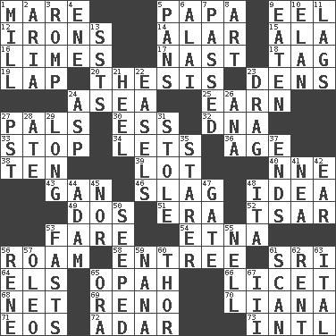 ACROSS 1. Female horse 5. Dad 9. Snakelike fish 12. Metal shackles 14. Having or resembling wings 15. In the manner of 16. Citrus fruits 17. Political cartoonist Thomas 18. Label 19. Pet locale 20. College paper 23. Hiding places for outlaws 24. Toward the sea 25. Merit 27. Friends 30. Curvy letter 32. Heredity factor (abbr.) 33. Halt 34. Allows 36. Mature 38. Nine, plus one 39. Car dealer's back yard 40. Compass dir. 43. Separate the seeds from cotton 46. Volcanic refuse 48. The content of cognition 49. Two (Sp.) 51. Epoch 52. Russian ruler of old 53. Conductor's collection 54. Inactive volcano in Sicily 56. Wander 58. Main course 61. _ Lanka 64. Raised railways 65. Brightly colored fish 66. It is permitted: Lat. 68. Fish or hair follower 69. Former U.S. Attorney General Janet 70. Climbing, woody, usually tropical vines 71. Greek goddess of the dawn 72. The sixth month of the Jewish calendar 73. International (abbr.) DOWN 1. Place where flour is made 2. Operatic vocal solo 3. Play 4. Compass dir. 5. Zero-star reviews 6. Jai _ 7. Went by 8. Tate display 9. Ingested 10. Style 11. Falls behind 13. Fast planes 21. Person who is morally reprehensible 22. Artist's stands 23. To be drawn or hauled along 24. Cleo's killer 26. Santa ___, CA 27. Pacific Standard Time (abbr.) 28. Had dinner 29. Yearn 31. Fur scarf 35. A viewer who gazes fixedly 37. Conclusions 41. Teachers' org. 42. Hearing organ 44. First man 45. And not 47. Yard entry 48. Call ___ day 50. Oozed 53. Goes without food and/or water 55. 1994 drama film starring Jodie Foster 56. French philosopher Descartes 57. Margarine 59. Nanny 60. Son of Odin 61. Examine minutely or intensely 62. Monthly bill 63. Slanted text style (abbr.) 65. Mouth or opening 67. One more than two